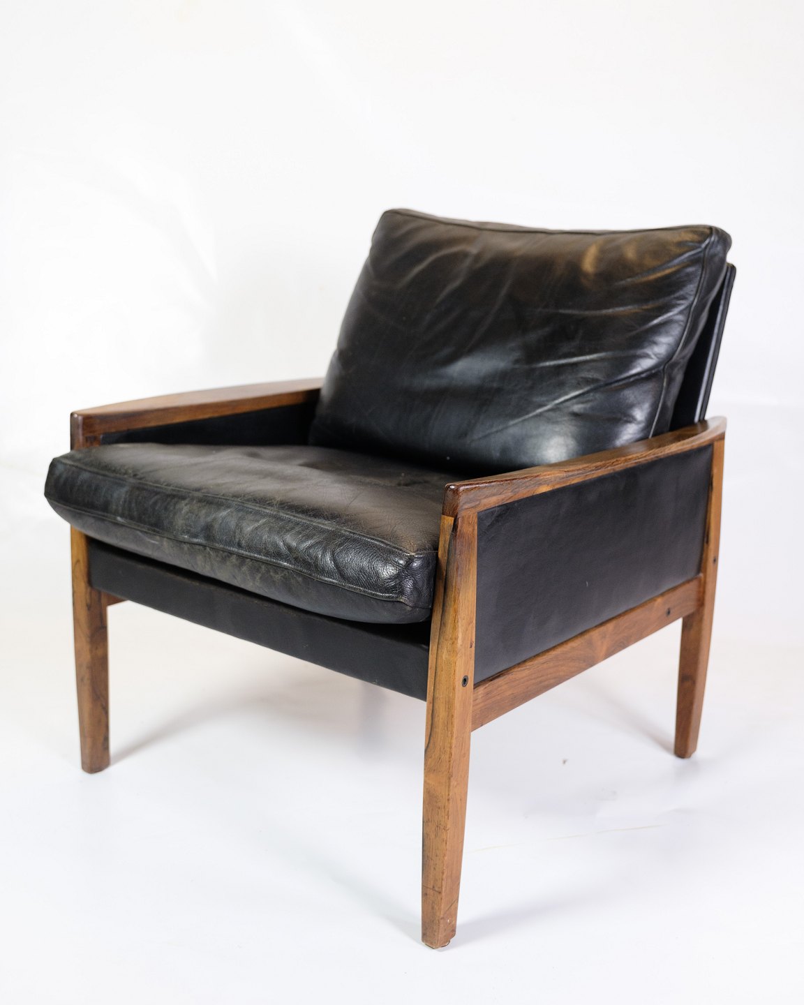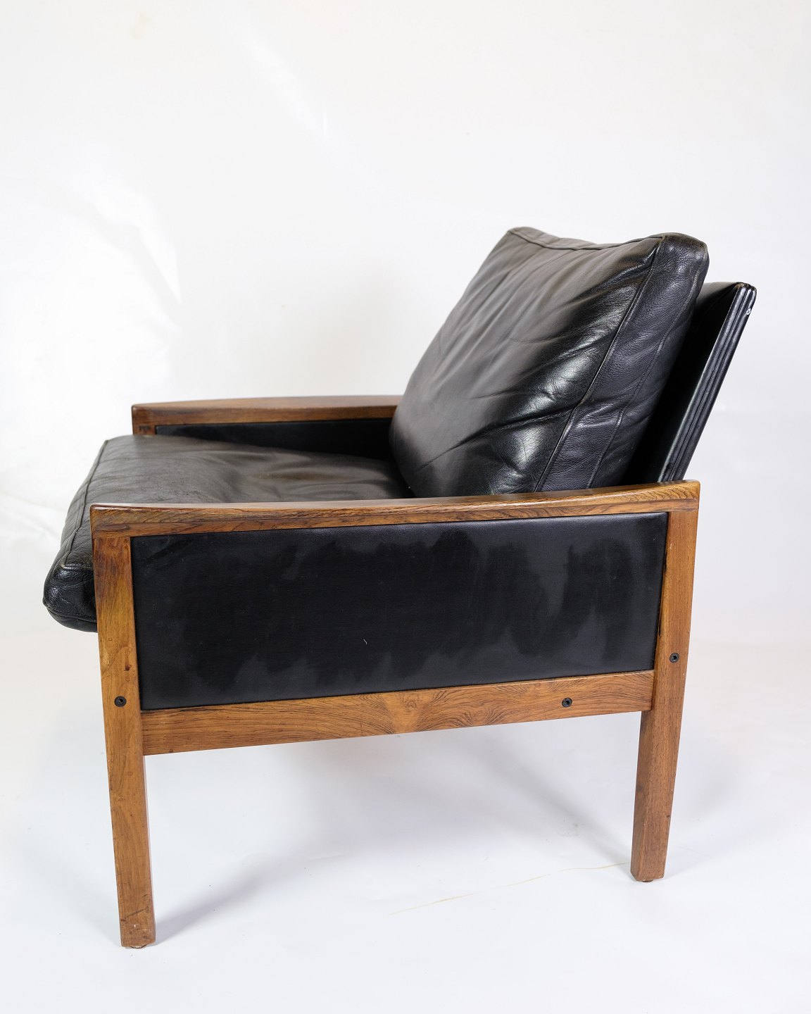 SoldThis set of two elegant armchairs in rosewood with black leather cushions exudes classic Danish design at its finest. The rich color and beautiful grain of the rosewood gives these chairs a luxurious and timeless elegance, while the soft, black leather ensures a comfortable sitting experience.