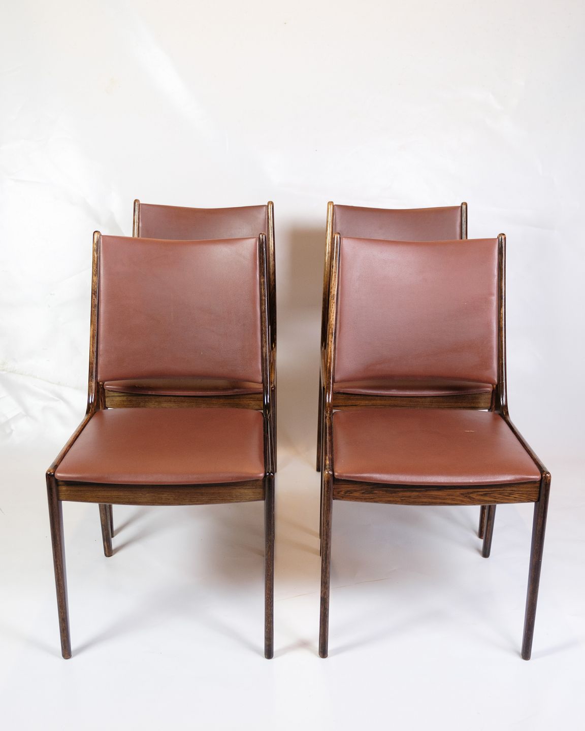 SoldThis set of four dining table chairs combines timeless elegance with high functionality. Made from solid rosewood and upholstered in cognac leather, these chairs offer a comfortable seating experience and a beautiful aesthetic for any dining area. Their slim and ergonomic design makes them ideal for long meals and cozy gatherings with family and friends.