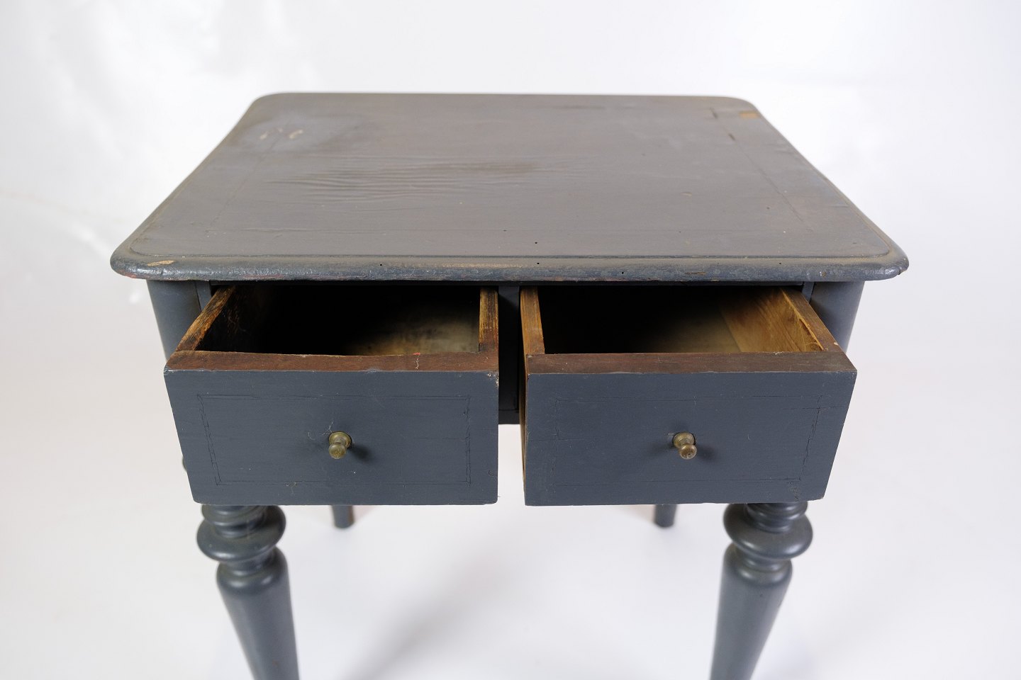 Antique Side table from around 1890, hand painted in an enchanting grey-blue colour. This beautiful side table exudes true vintage charm and historic elegance. With two spacious drawers for practical storage, this piece of furniture combines function with aesthetics in an enchanting way.