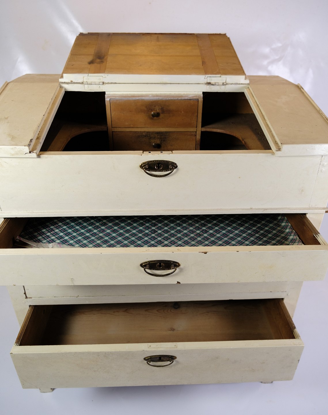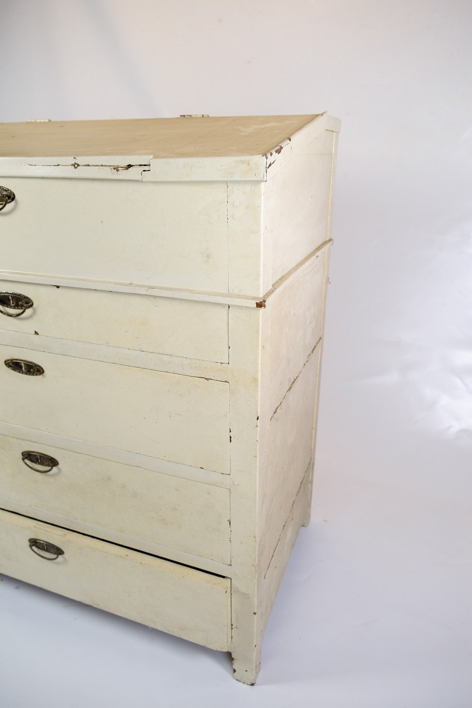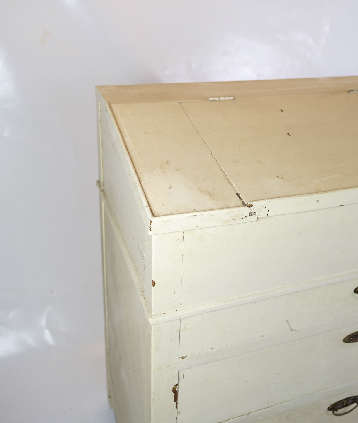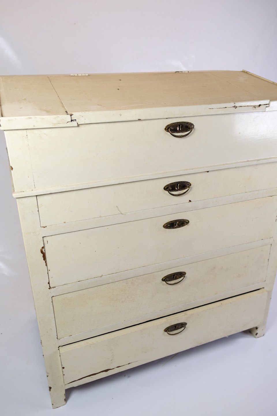 SoldThis antique dresser/desk from around 1890 is an impressive piece of furniture history. With its white painted finish, it exudes a timeless elegance and charm. The five spacious drawers offer practical storage space for various items, while the versatile design makes it suitable for both storage and work purposes. The chest's older age contributes to its authentic patina and historic appeal, making it an impressive element in any room.