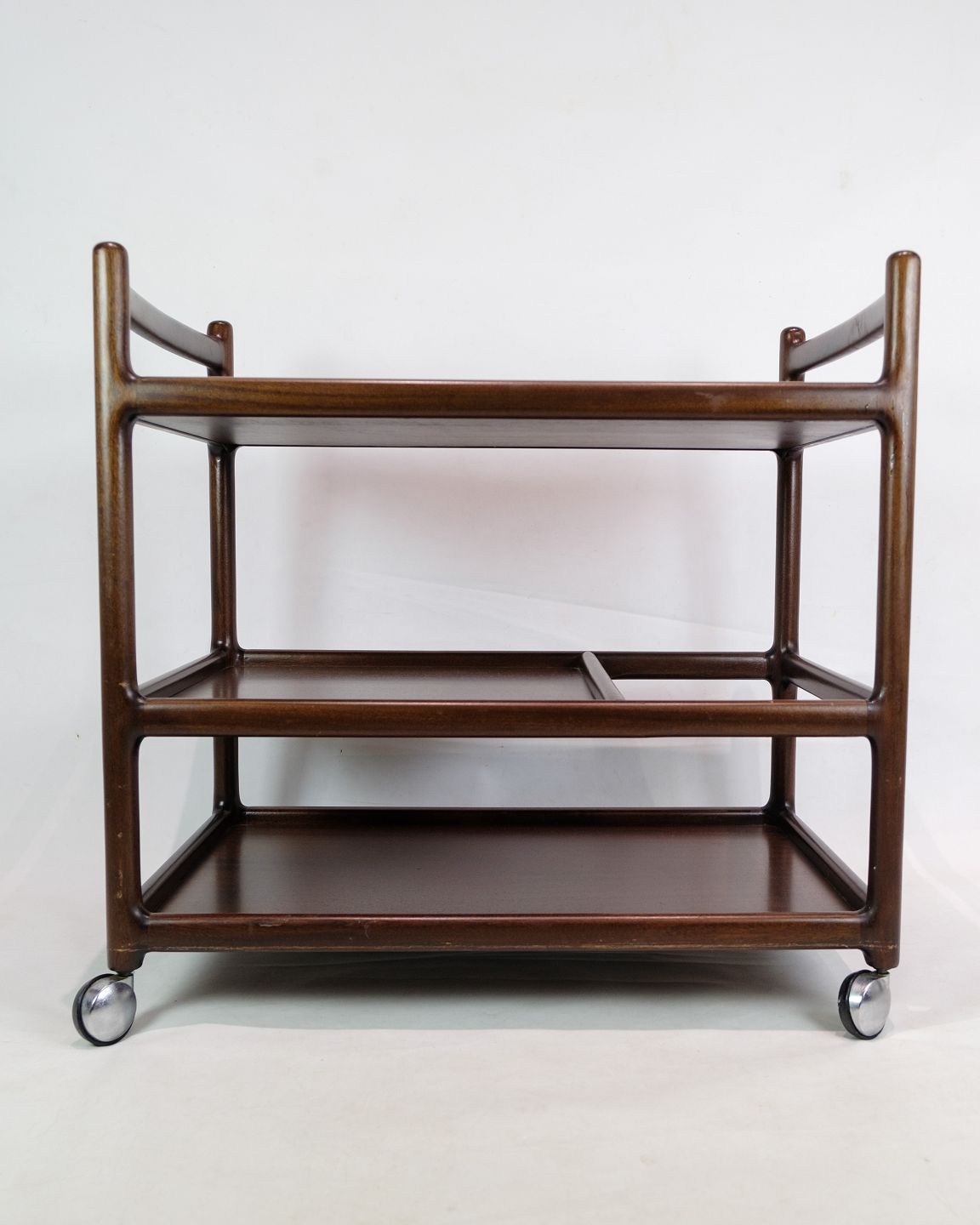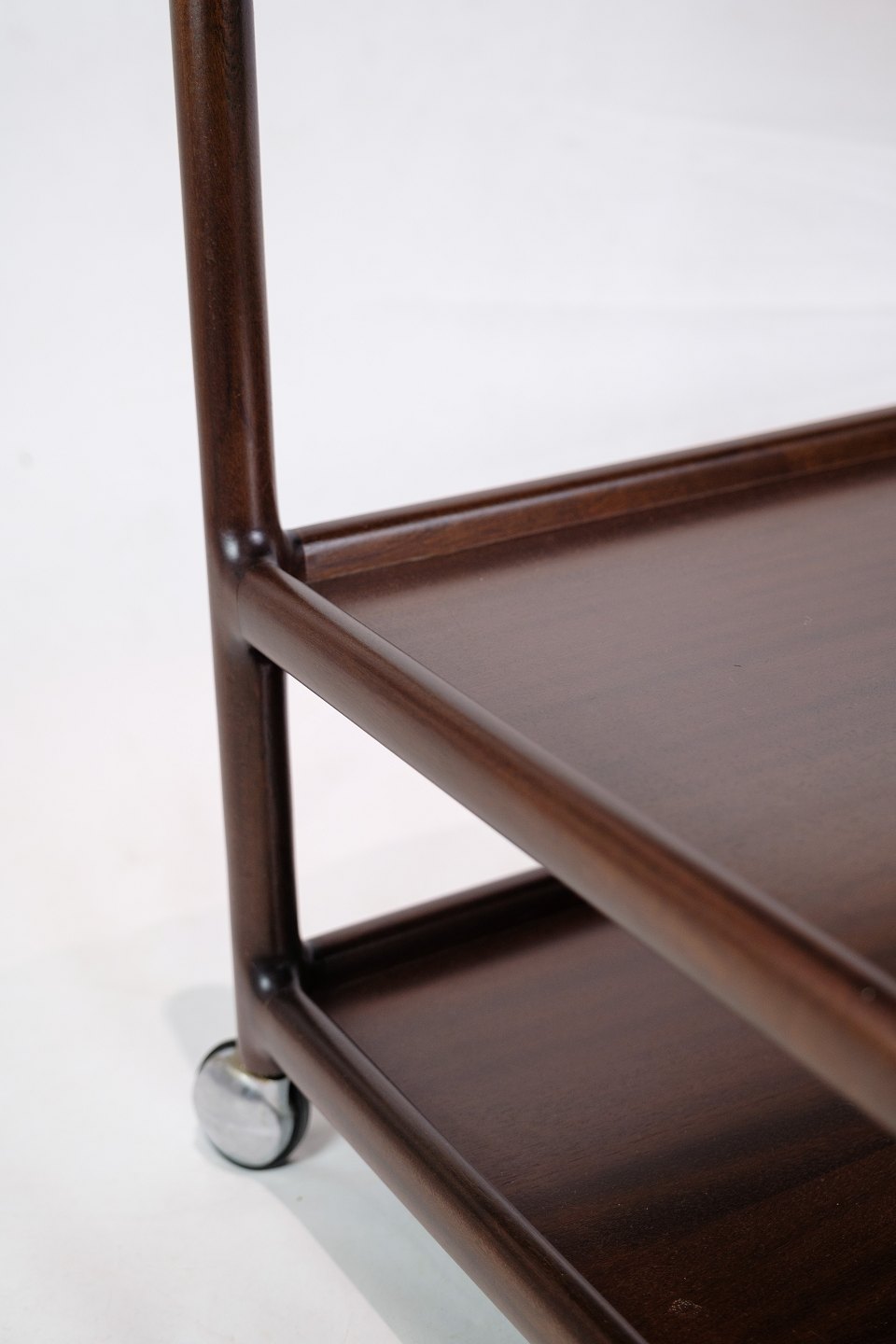SolgtDenne serveringsvogn er et fortryllende eksempel på Henning Korch´s designæstetik fra 1960'erne og blev produceret af Silkeborg Møbelfabrik. Lavet af mahognitræ udstråler vognen en varm og indbydende atmosfære, der er typisk for denne æra af dansk design.