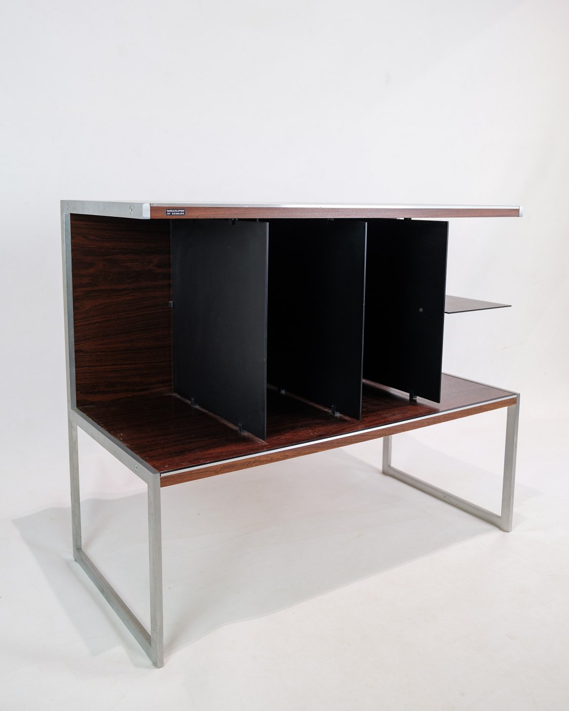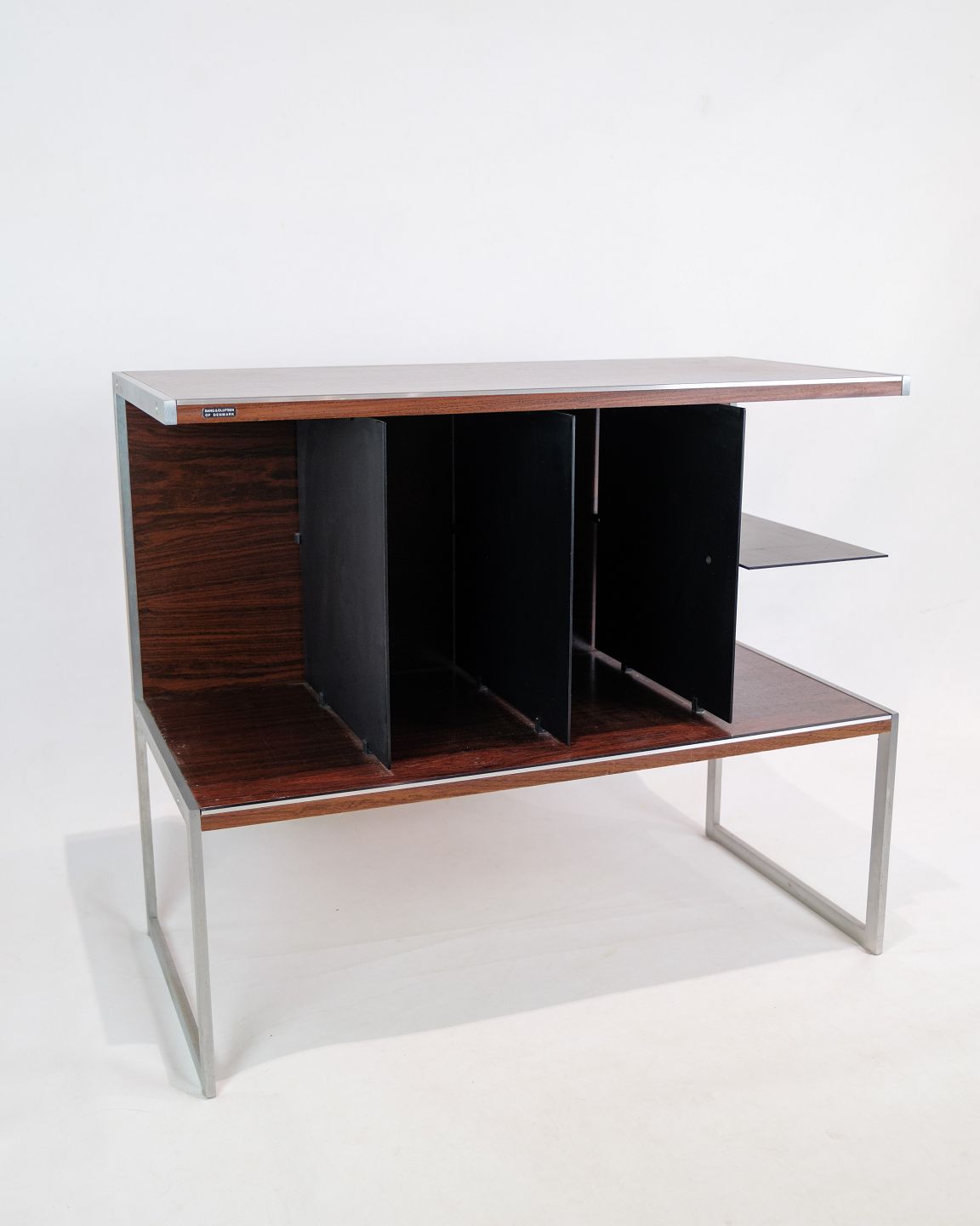 Palisanderets varme tone og aluminiumets slanke profil skaber en kontrastfyldt, men harmonisk helhed, der vil tilføje karakter til enhver stue eller rum. Møblet er designet til at matche Bang & Olufsens ikoniske lyd- og videoudstyr, hvilket giver et ensartet og stilfuldt udseende.