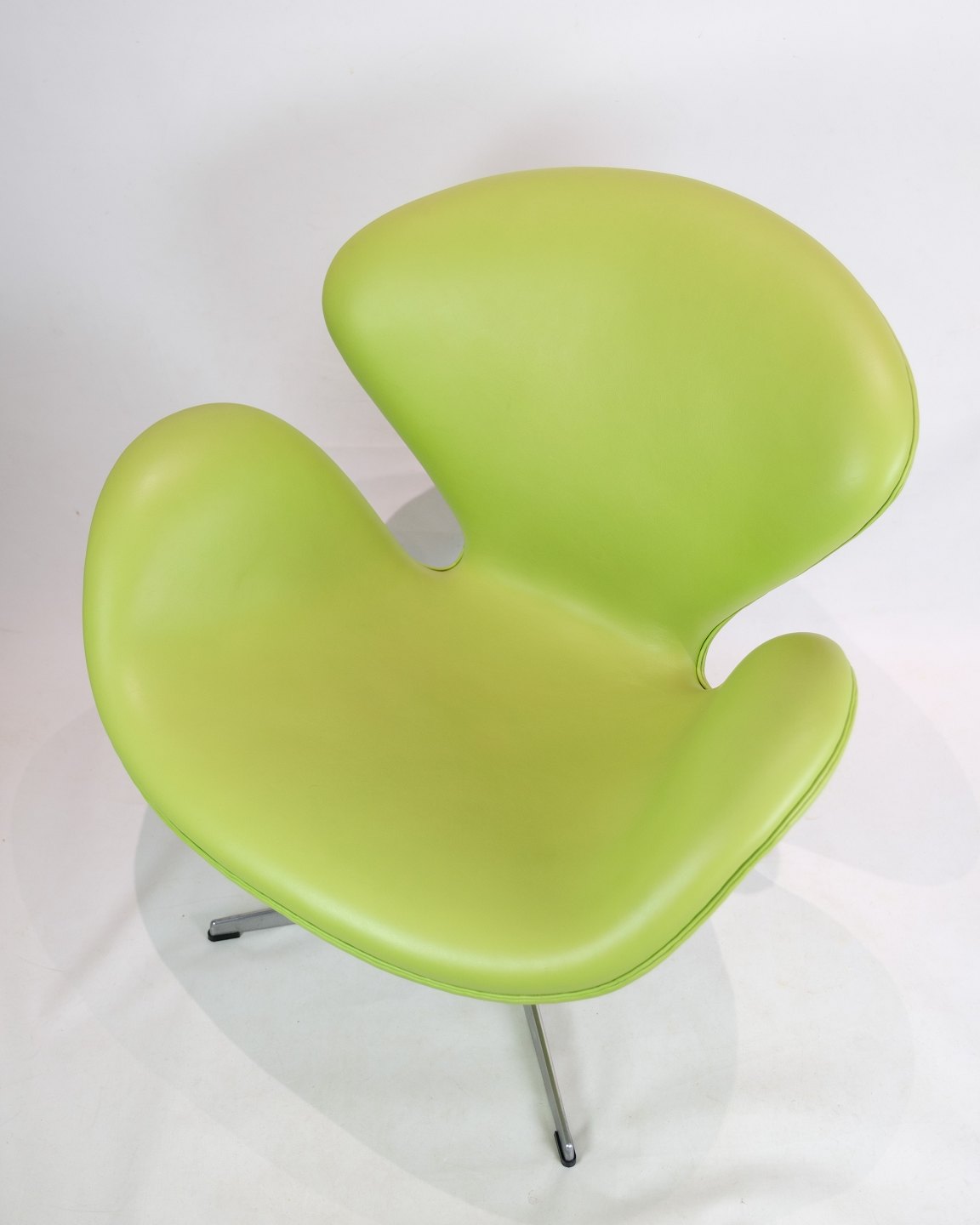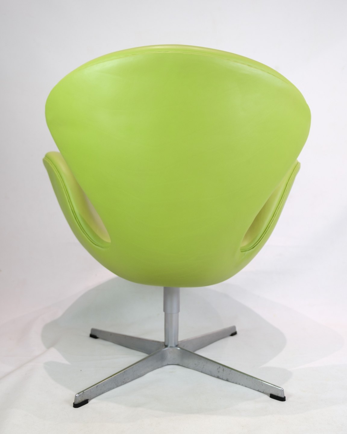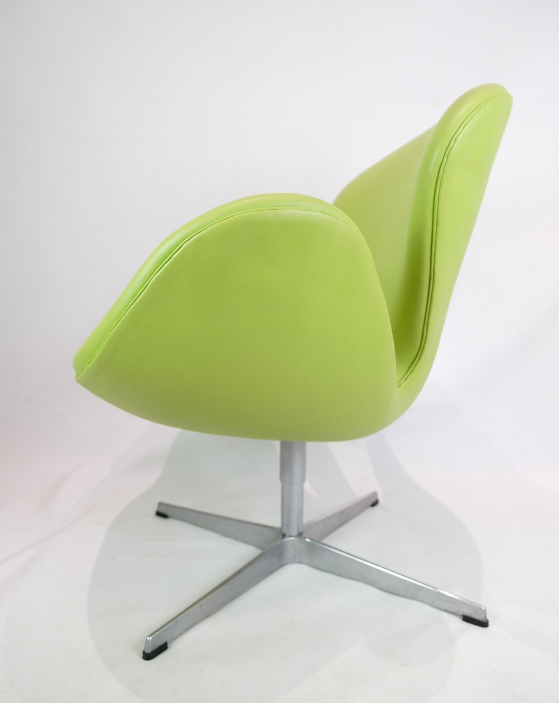 Denne særlige udgave af "Svanen" fra 2007 præsenterer et livligt og dristigt valg af limegrønt læder, der tilføjer en friskhed til enhver indretning. Arne Jacobsens vision om at skabe møbler, der både er smukke og behagelige, realiseres fuldt ud i denne stol.