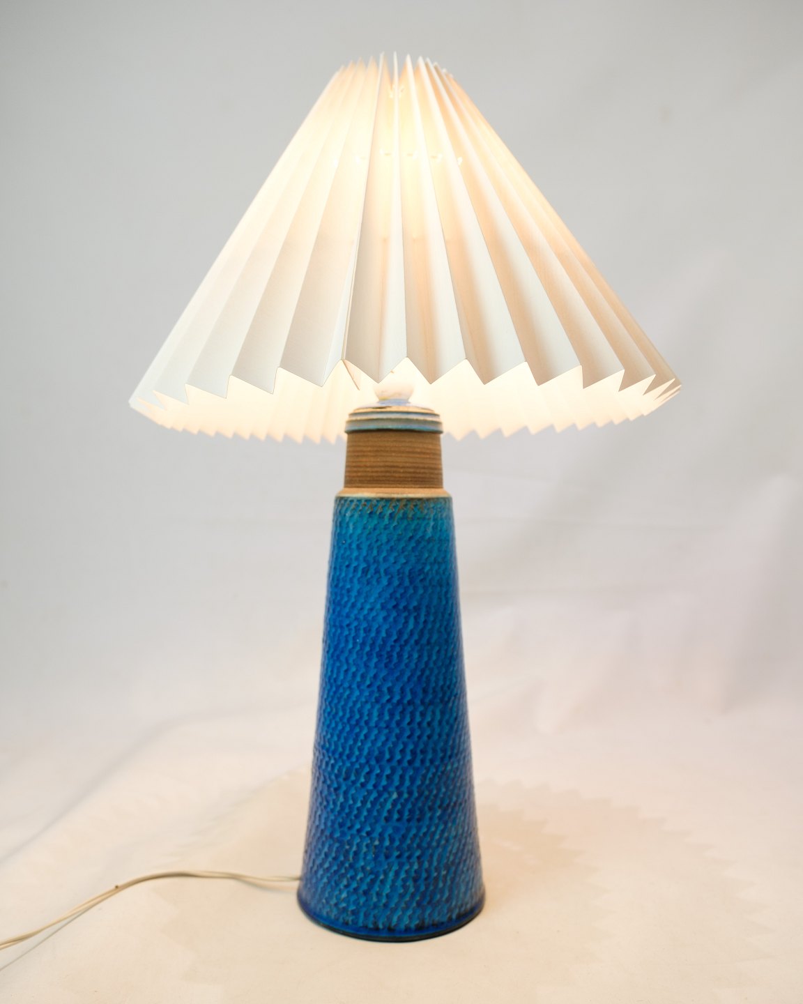 Dette sæt af to bordlamper er enestående eksempler på designskønhed, skabt af Nils Kähler og produceret af Herman A. Kähler. Lampens blå farve og sildebensmønster giver et umiskendeligt og charmerende udtryk, der skaber en unik atmosfære i ethvert rum.