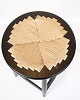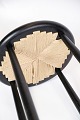 The chair's frame is made of black lacquered wood, which gives it a slim and stylish appearance. The seat is woven, adding texture and warmth to the overall design. This combination of materials and construction results in a bar stool that is both durable and comfortable to sit on.