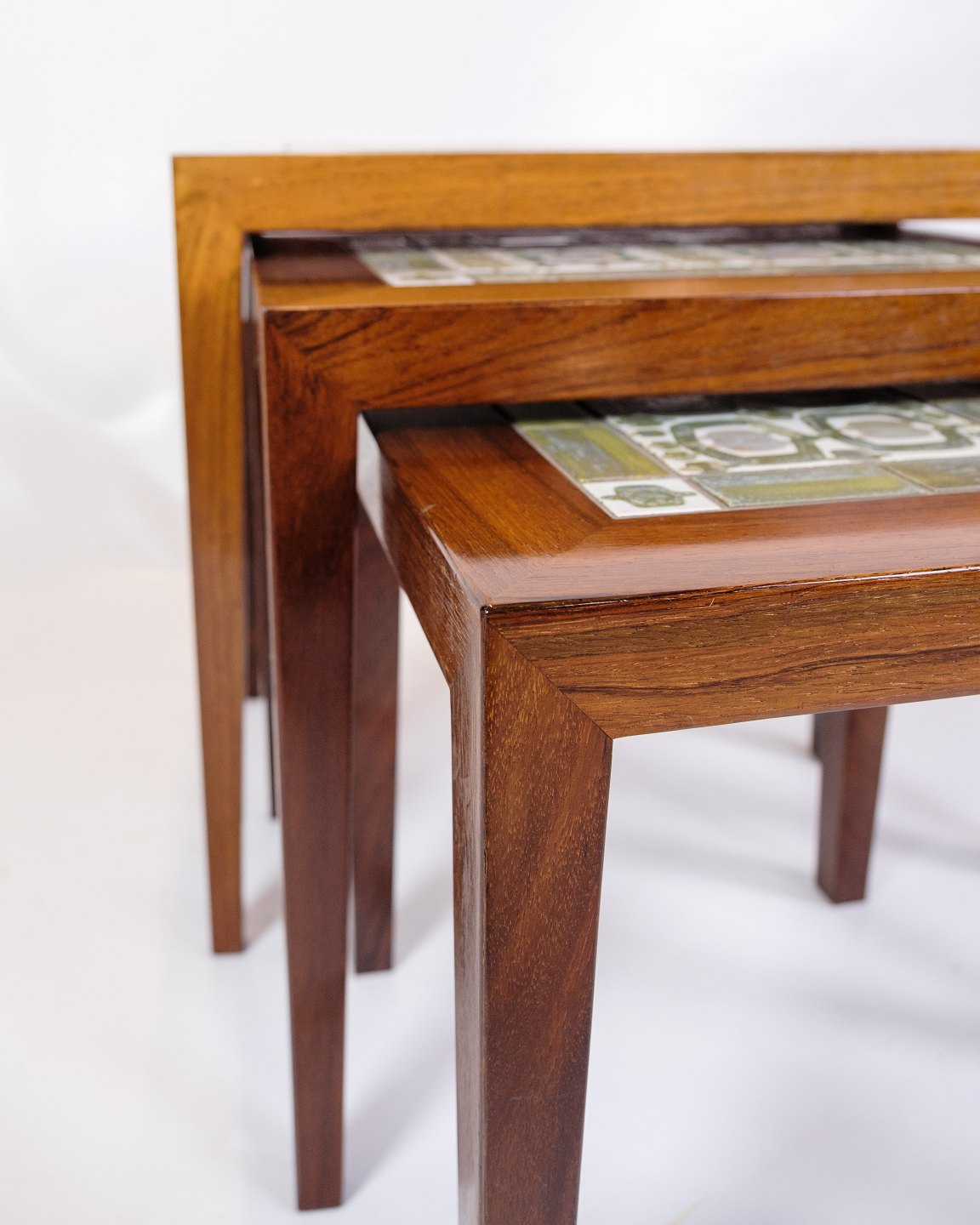 This set of side tables, designed by Severin Hansen in the 1960s, is an excellent example of Danish mid-century modern design. The tables are made of beautiful rosewood and decorated with Royal Copenhagen tiles, creating an elegant combination of natural materials and artistic decoration.