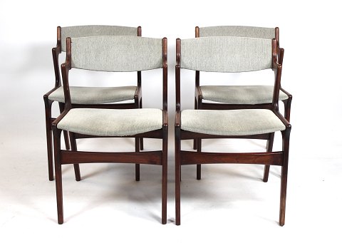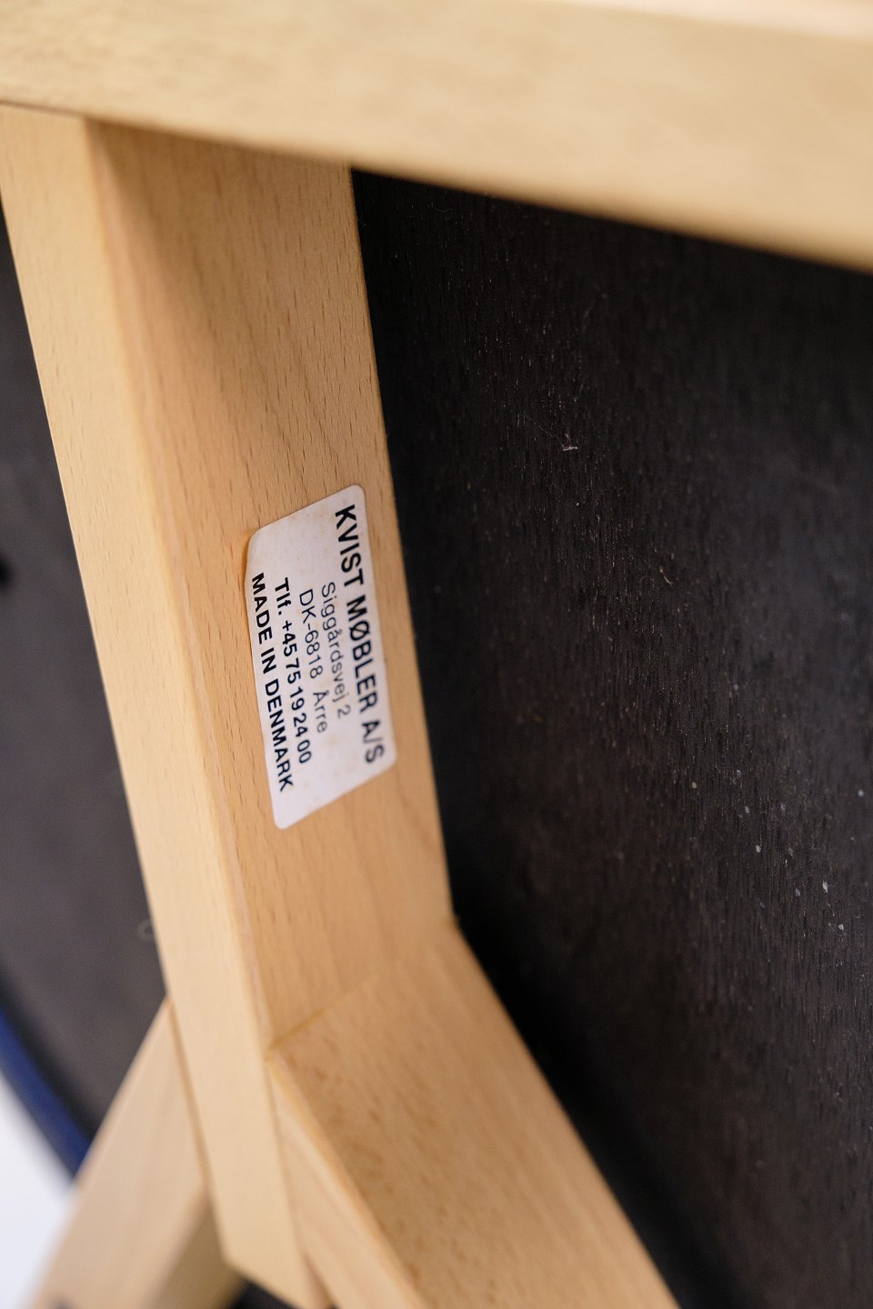 Dette sæt af fire spisestuestole fra 1960'erne, designet og fremstillet af Kvist Møbler, er et fremragende eksempel på dansk mid-century modern design. Stolene kombinerer stel af bøg med sorte skaller og sæder betrukket i blåt stof, hvilket skaber en elegant og tidløs æstetik.