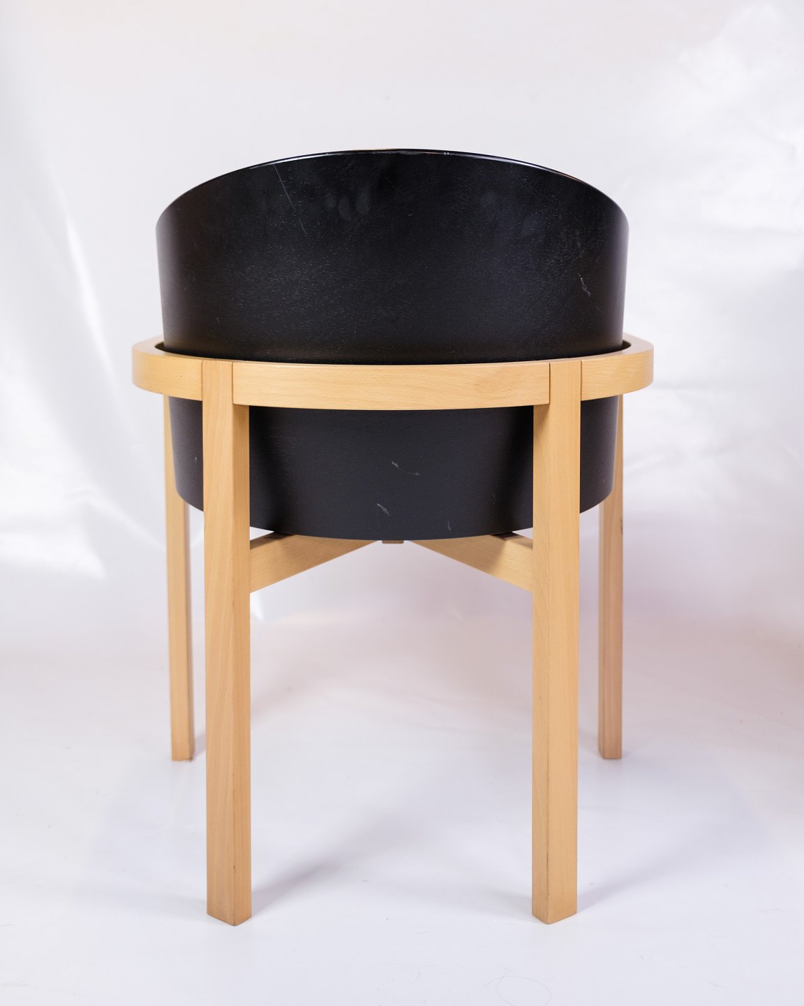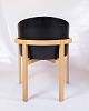 De sorte skaller på stoleryggene giver en flot kontrast til det lyse bøgetræ og tilføjer en moderne og stilfuld dimension til designet. Den sorte farve skaber en elegant ramme om sæderne, der er betrukket med blåt stof. Det blå stof giver en frisk farveaccent og er samtidig komfortabelt og slidstærkt, hvilket sikrer, at stolene forbliver behagelige og attraktive over tid.