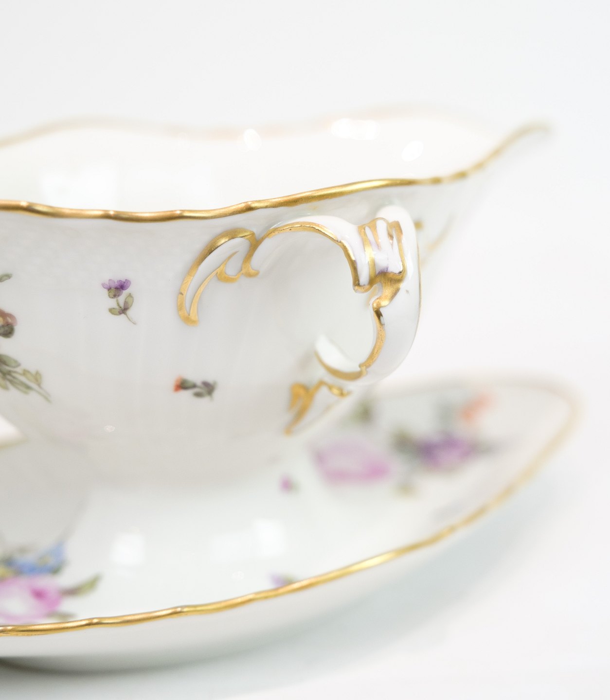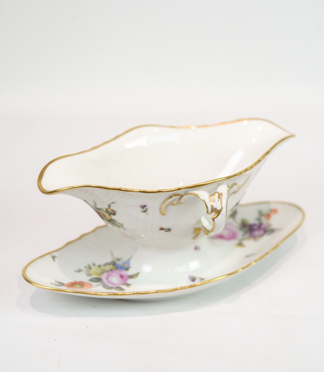 Sauce bowl of Royal porcelain with patterned Saxon flower decorated on the edge with gold. Manufactured by Royal Copenhagen in approx. 1923, where all their goods have been hand painted and subsequently become very rare. The sauce bowl is without flaws or defects.