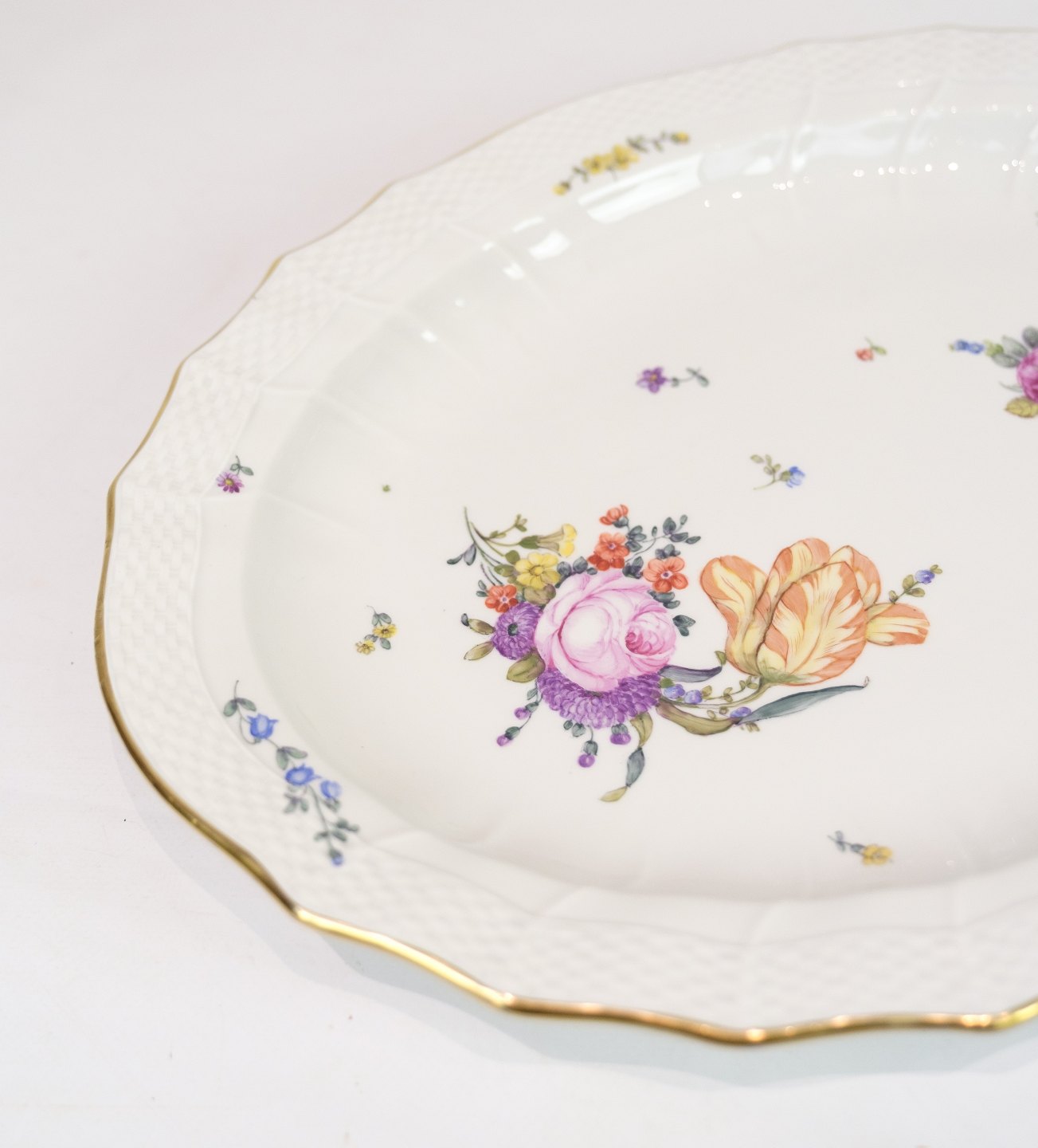 Dish of Royal porcelain with patterned Saxon flower decorated on the edge with gold. Manufactured by Royal Copenhagen in approx. 1923, where all their goods have been hand painted and subsequently become very rare. The dish is without flaws or defects.