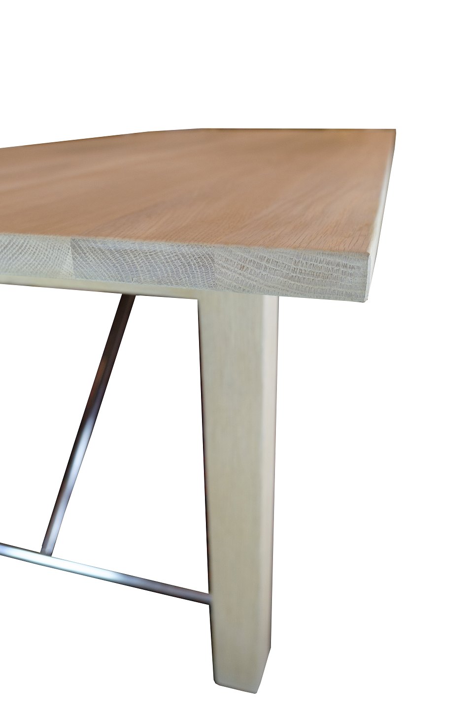 Spisebord af Massiv egetræ tegnet af Hans Thyge Raunkjær fremstillet af Trip trap med skråstiver af forkromet metal. Bordet er blevet efterset på vores værksted og står i meget flot stand. Næsten som nyt.