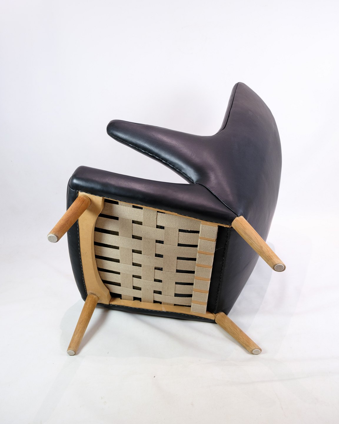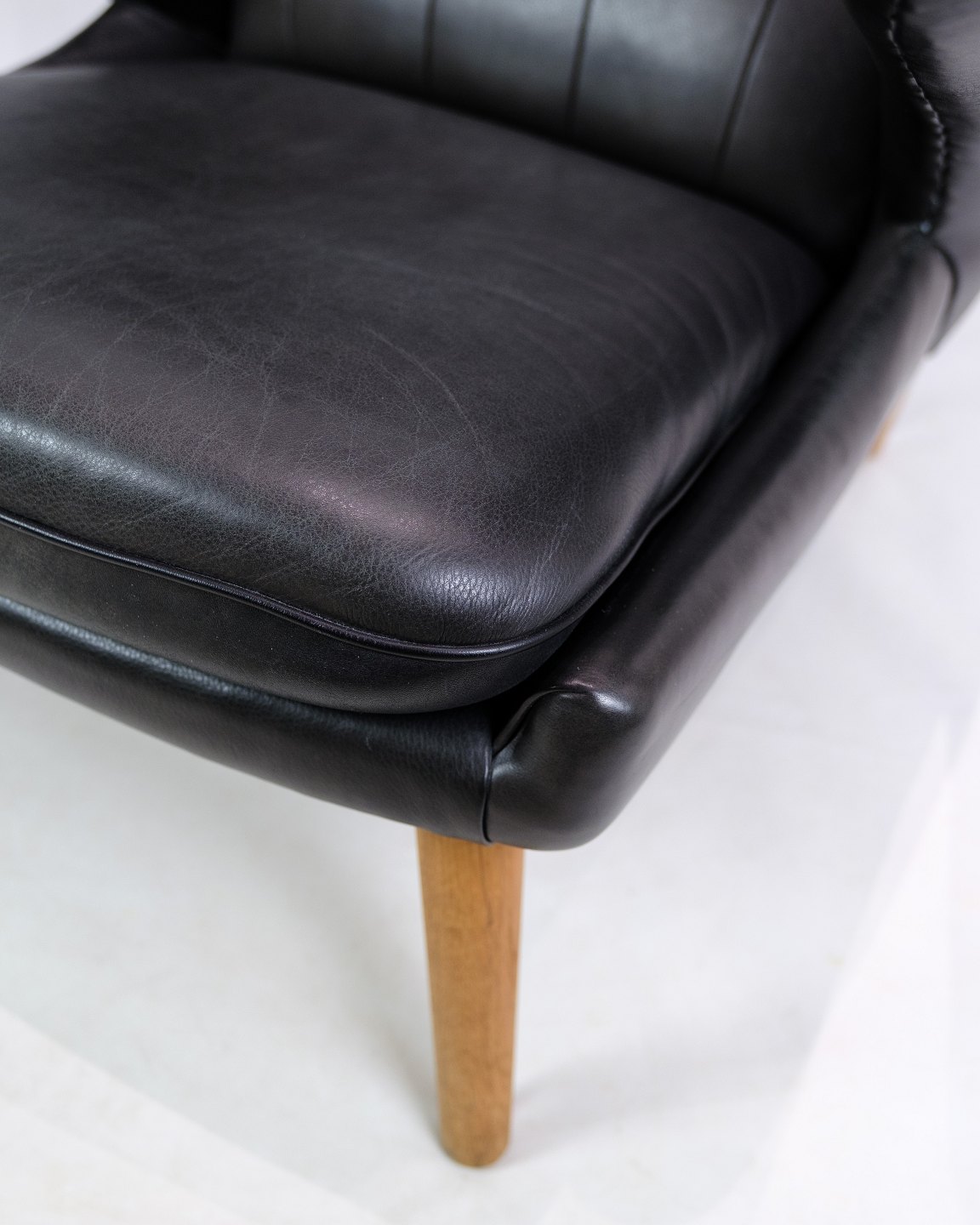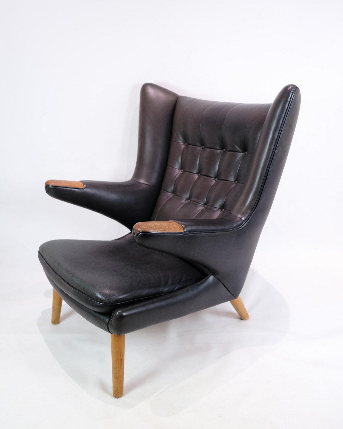 SoldThe armchair, Model AP 19 also known as the "Papa Bear Chair", designed by Hans J. Wegner in 1951 and manufactured by P.P Møbler, is an icon in Danish design. The chair is upholstered in luxurious black leather, which ensures both comfort and a stylish look. The armrests, known as the "nail," are made of teak wood, while the legs are made of solid oak, providing a beautiful contrast and durability.