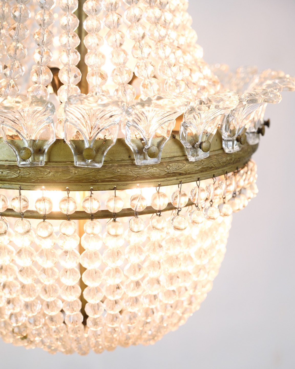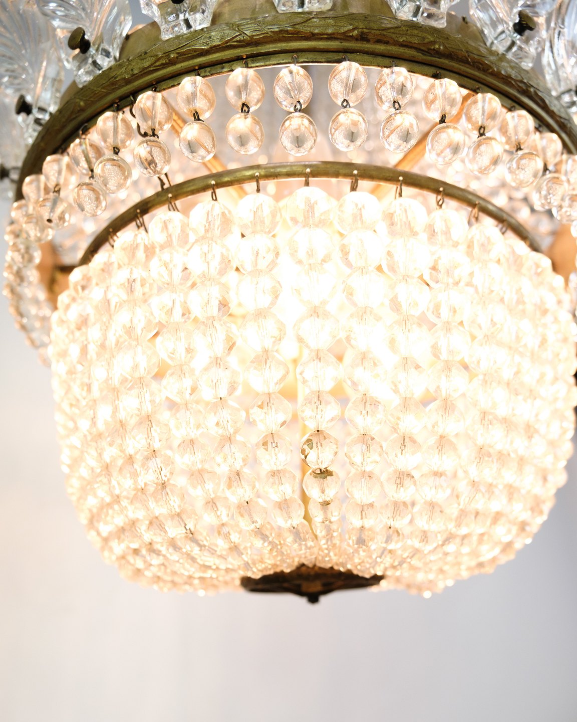 Antique prism chandelier from the year 1890, made of brass and bronze, gilded and decorated with crystals. This chandelier is an example of the fine craftsmanship of the period, where precious metals and crystals create a luxurious and timeless atmosphere.