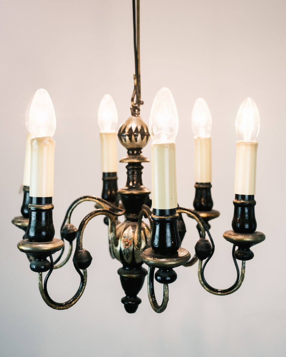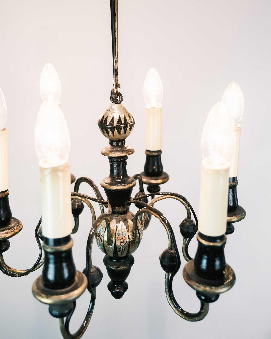 Kirkekrone med 6 arme, udført i træ og dekoreret med guld, fra 1930'erne. Denne lysekrone kombinerer klassisk håndværk med religiøs symbolik og tidens stil, hvilket gør den til et imponerende og historisk stykke.