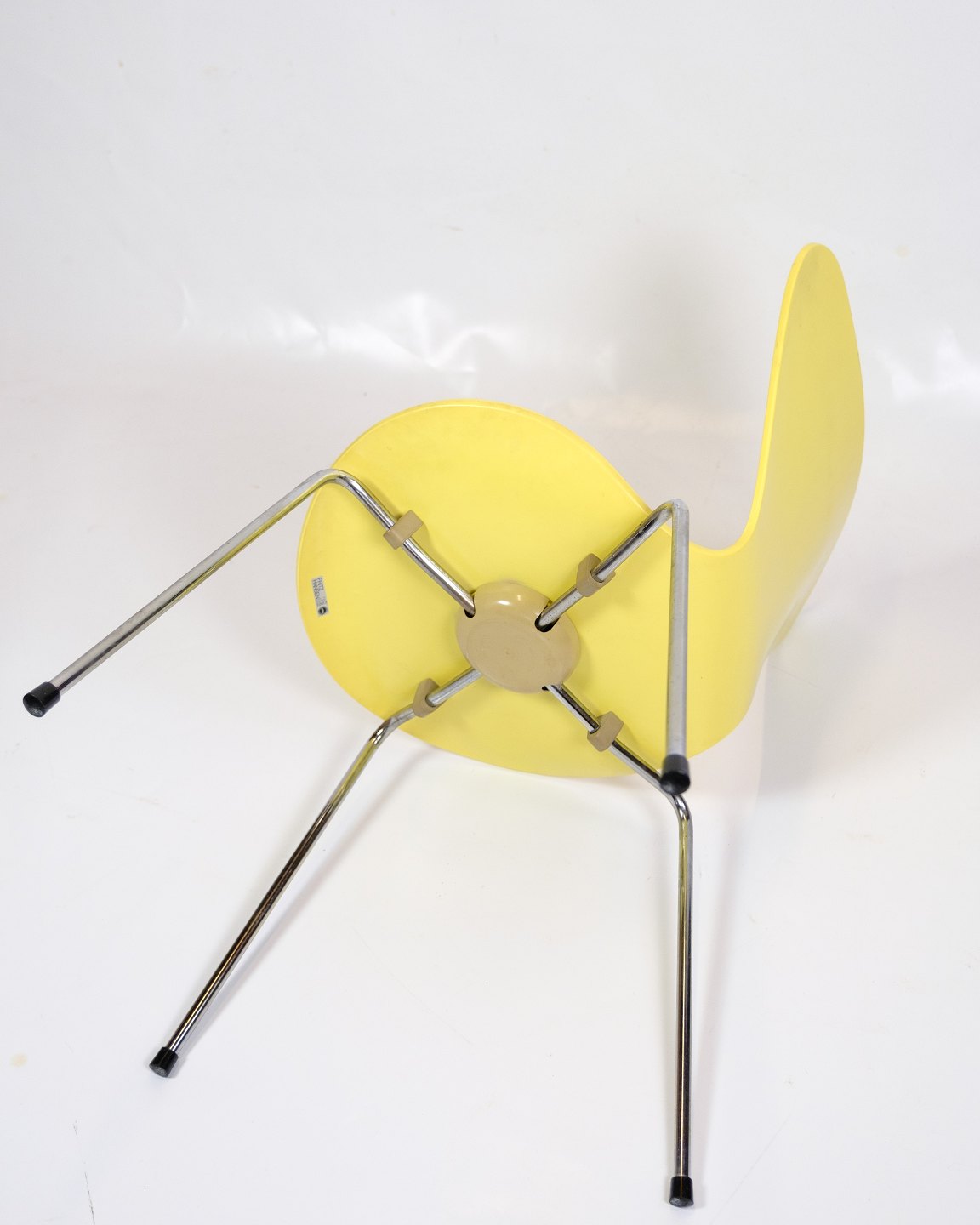 Set of 6 dining chairs, model 3107, also known as the "Seven chair", designed by Arne Jacobsen and produced by Fritz Hansen in the 1990s. The chairs are lacquered in a yellow colour, which gives them an elegant and timeless look. The Syver chair is known for its comfortable and iconic shape, which combines functionality with a stylish design.