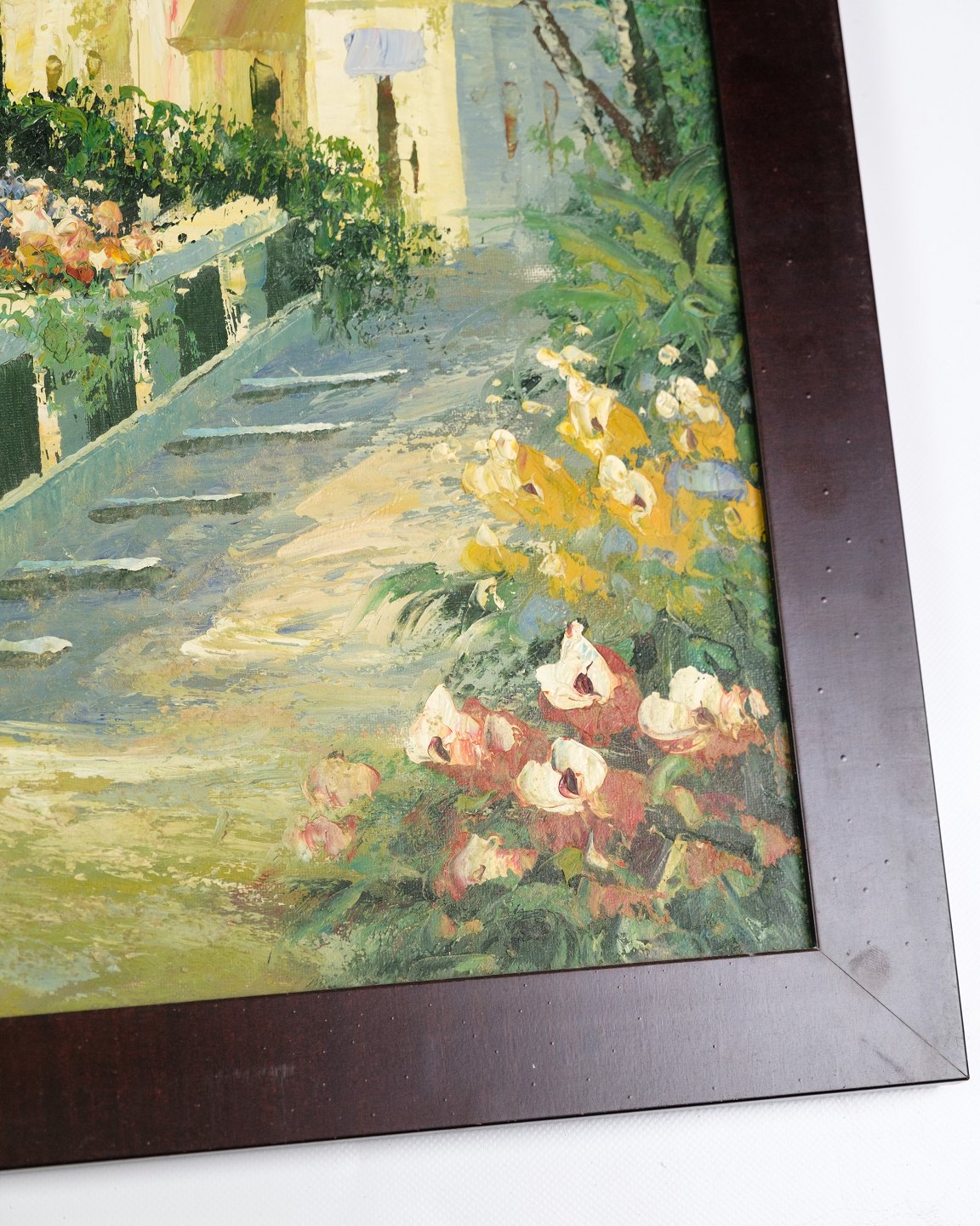 Oil painting framed in a black wooden frame with motif of a coastal town with warm colors. Signed by Mary L.