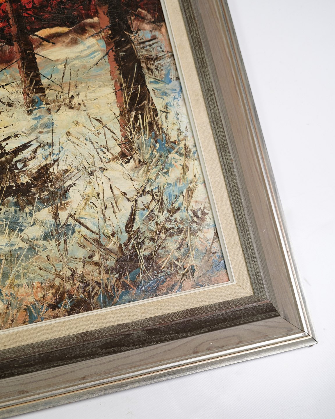 Oil painting with a motif of a snow-covered spruce forest and a sunset in the background, which creates an atmospheric light over the landscape. The painting is framed in a solid wooden frame, which emphasizes the natural beauty of the subject.