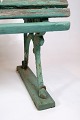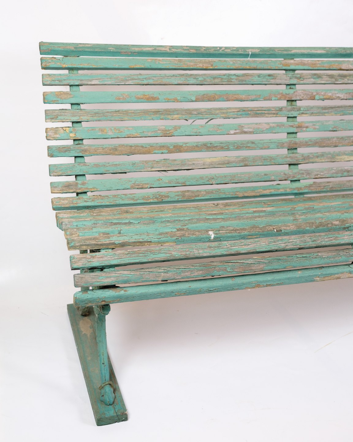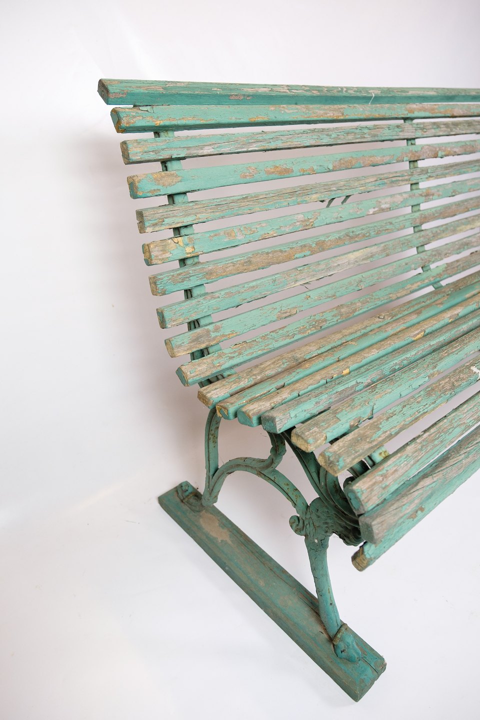 Antique French park benches from the 1930s, painted in a beautiful greenish color with a natural patina that reflects their age and history.