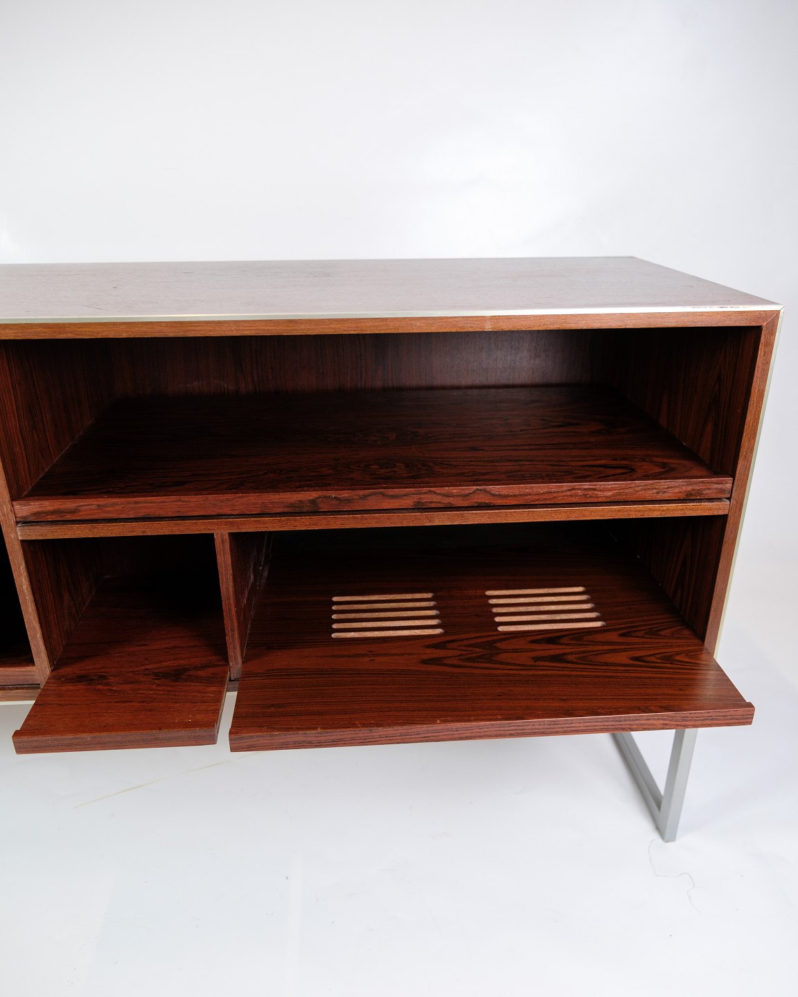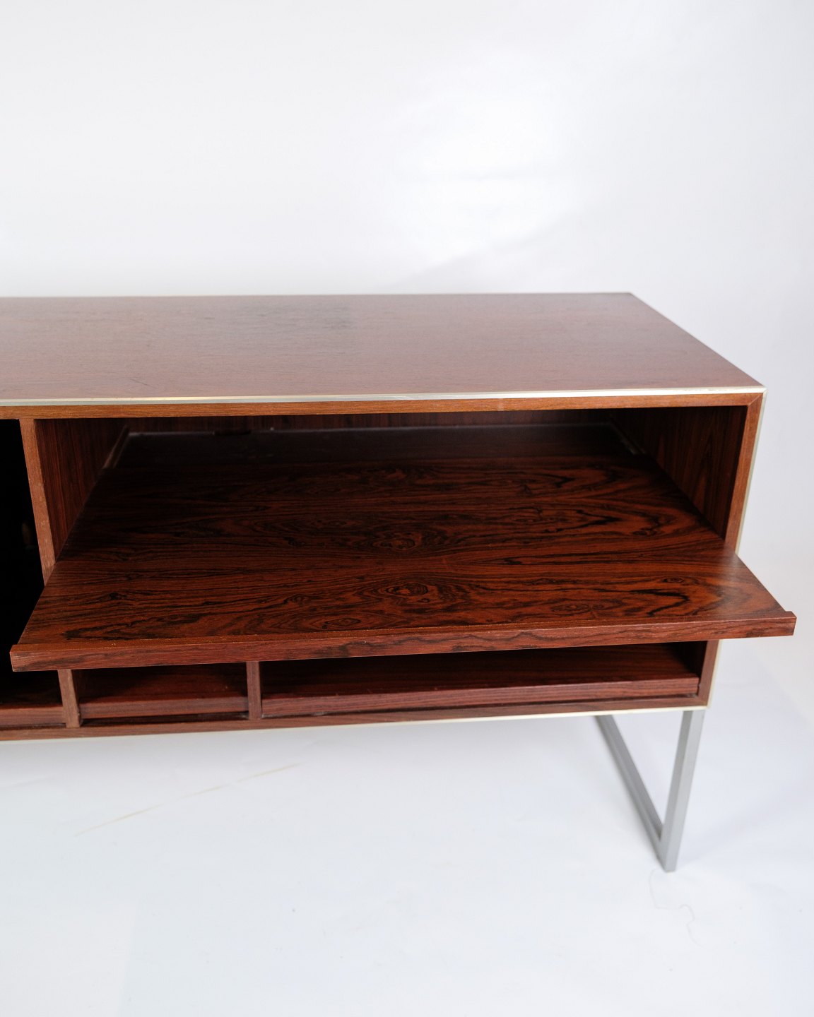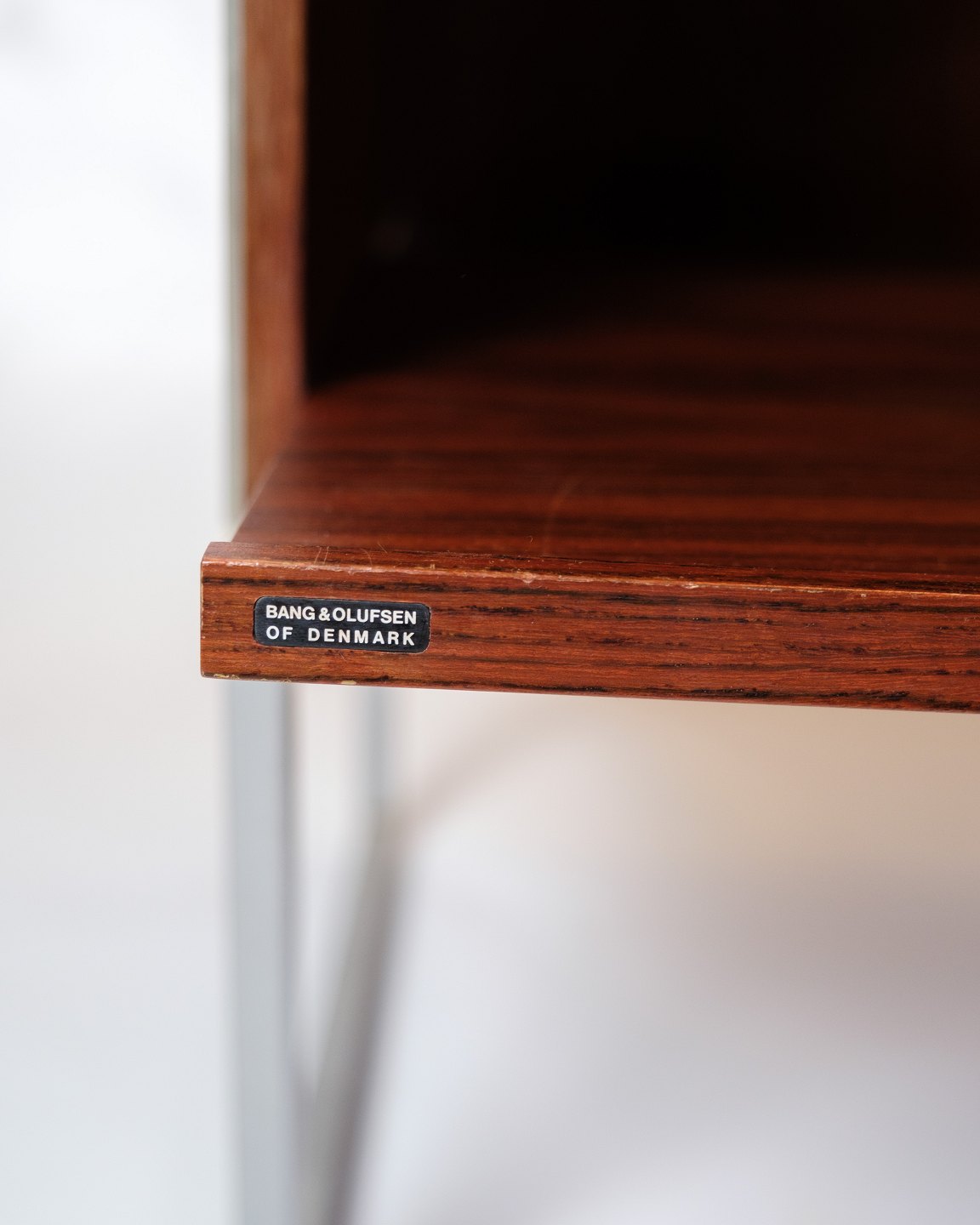 SolgtStereobænk/skænk i palisander med metalstel, designet af Jacob Jensen for Bang & Olufsen i 1970'erne. Denne elegante skænk kombinerer smukt palisandertræ med et slankt metalstel, hvilket giver den et minimalistisk og tidløst udseende.