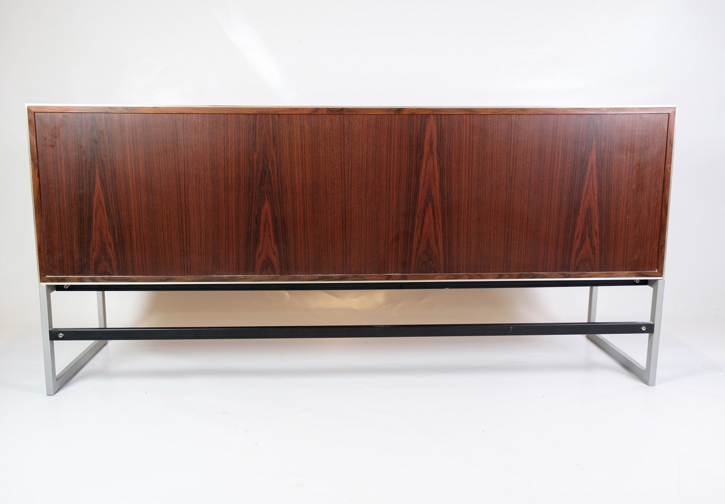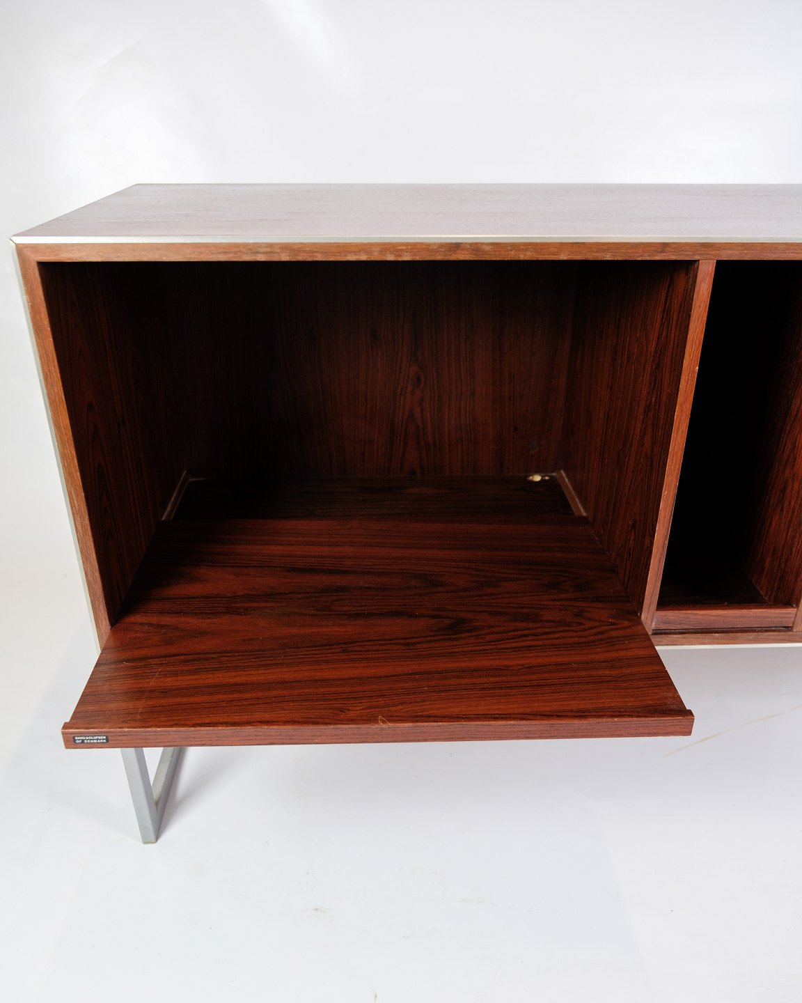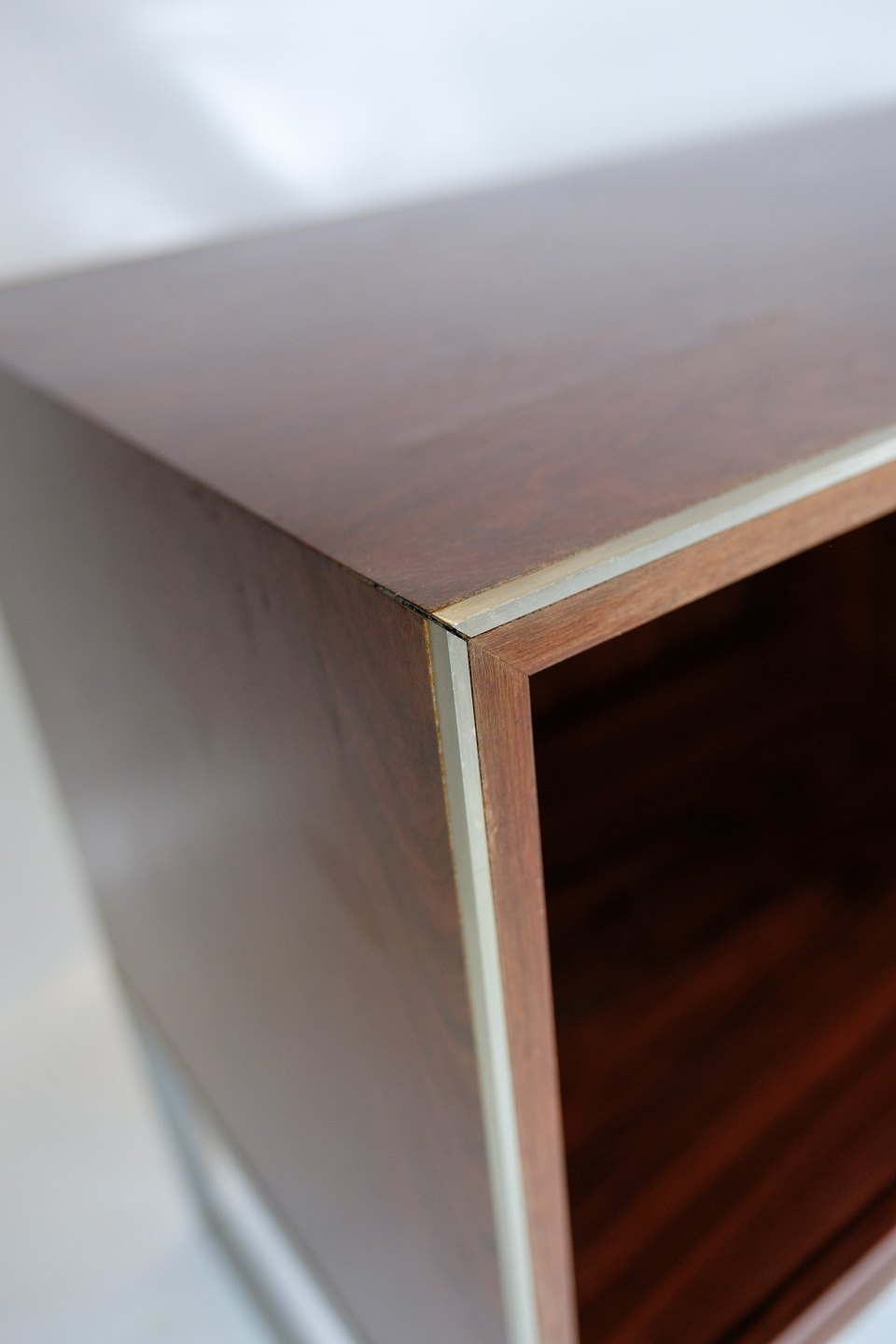 SolgtStereobænk/skænk i palisander med metalstel, designet af Jacob Jensen for Bang & Olufsen i 1970'erne. Denne elegante skænk kombinerer smukt palisandertræ med et slankt metalstel, hvilket giver den et minimalistisk og tidløst udseende.