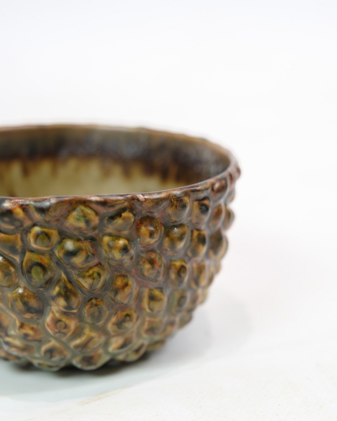 SoldBowl in stoneware, model 20566, decorated with sung glaze, designed by Axel Salto for Royal Copenhagen. Axel Salto was one of Denmark's most renowned ceramists, known for his organic and experimental forms as well as his use of decorative glazes, such as sung glaze, which gives a deep and vibrant surface.