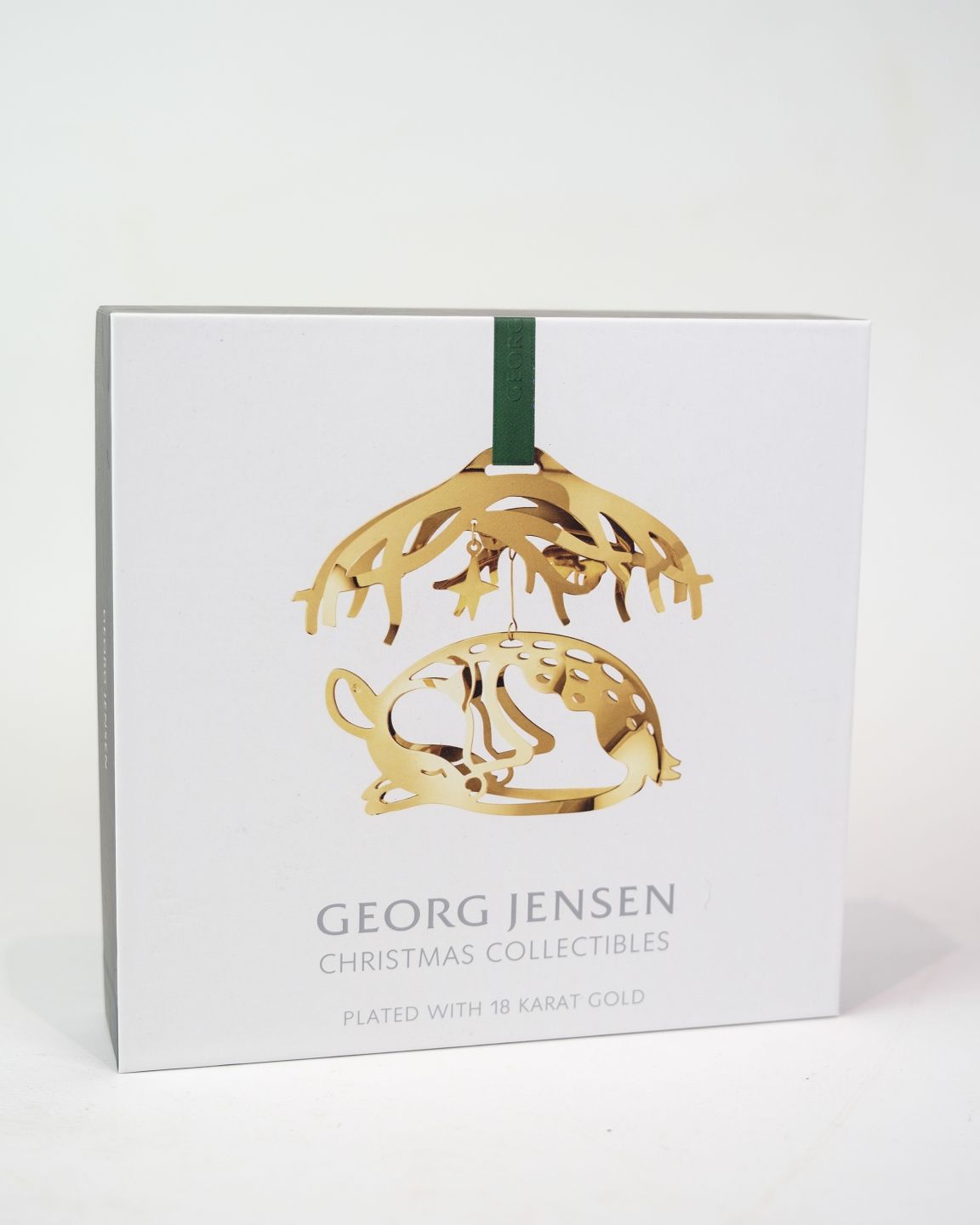 Christmas ornament featuring a reindeer, made of brass and gilded with 18-carat gold, designed by Sanne Lund Traberg for Georg Jensen in 2023. This beautiful ornament is part of Georg Jensen’s annual collection, which combines tradition and innovation. The ornament is crafted with great care, using high-quality materials, and the 18-carat gold gilding adds an elegant and festive touch.