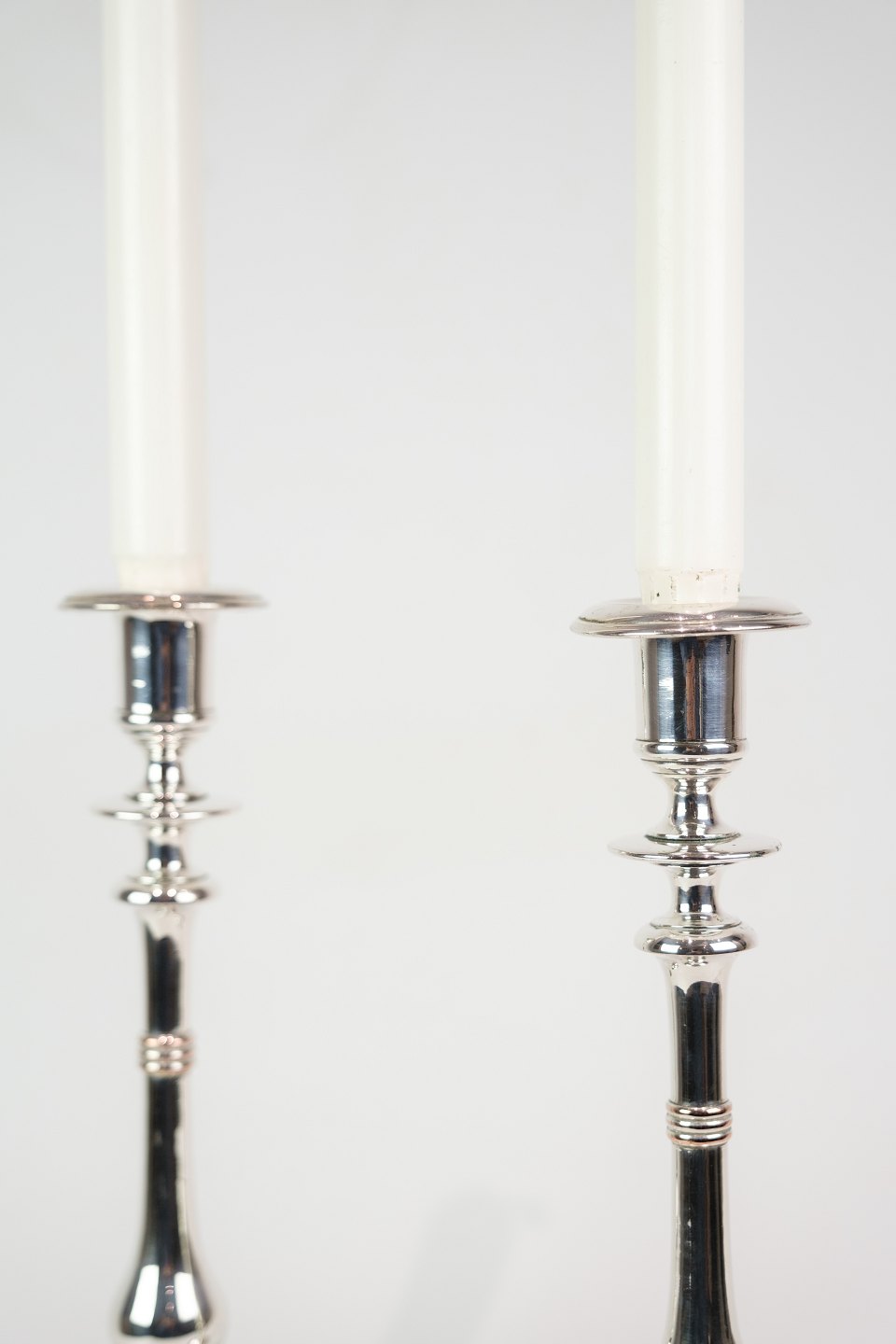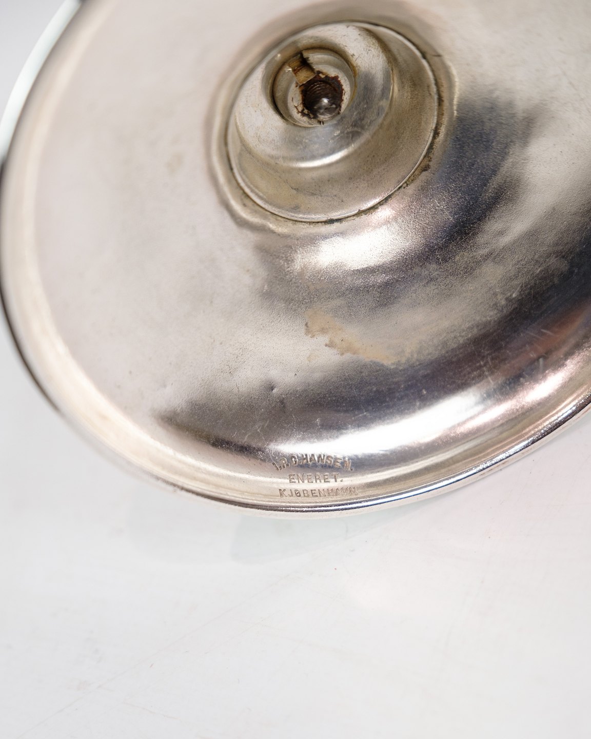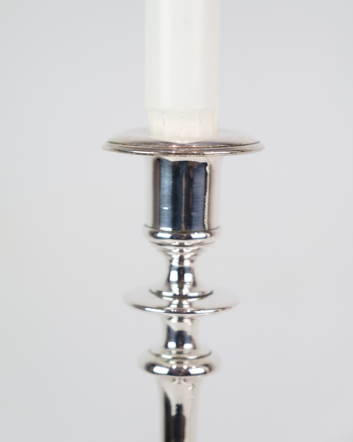 SolgtSæt af 2 lysestager udført i forsølvet messing, stemplet I.P.O Hansen, København, fra 1890'erne. Lysestagerne bærer tydelige præg af tidens håndværk og har et klassisk design, der kombinerer både elegance og holdbarhed. Stemplet fra I.P.O Hansen indikerer deres oprindelse i København, hvor sølv- og messinghåndværk fra den periode er kendt for sin kvalitet og omhu i detaljer.