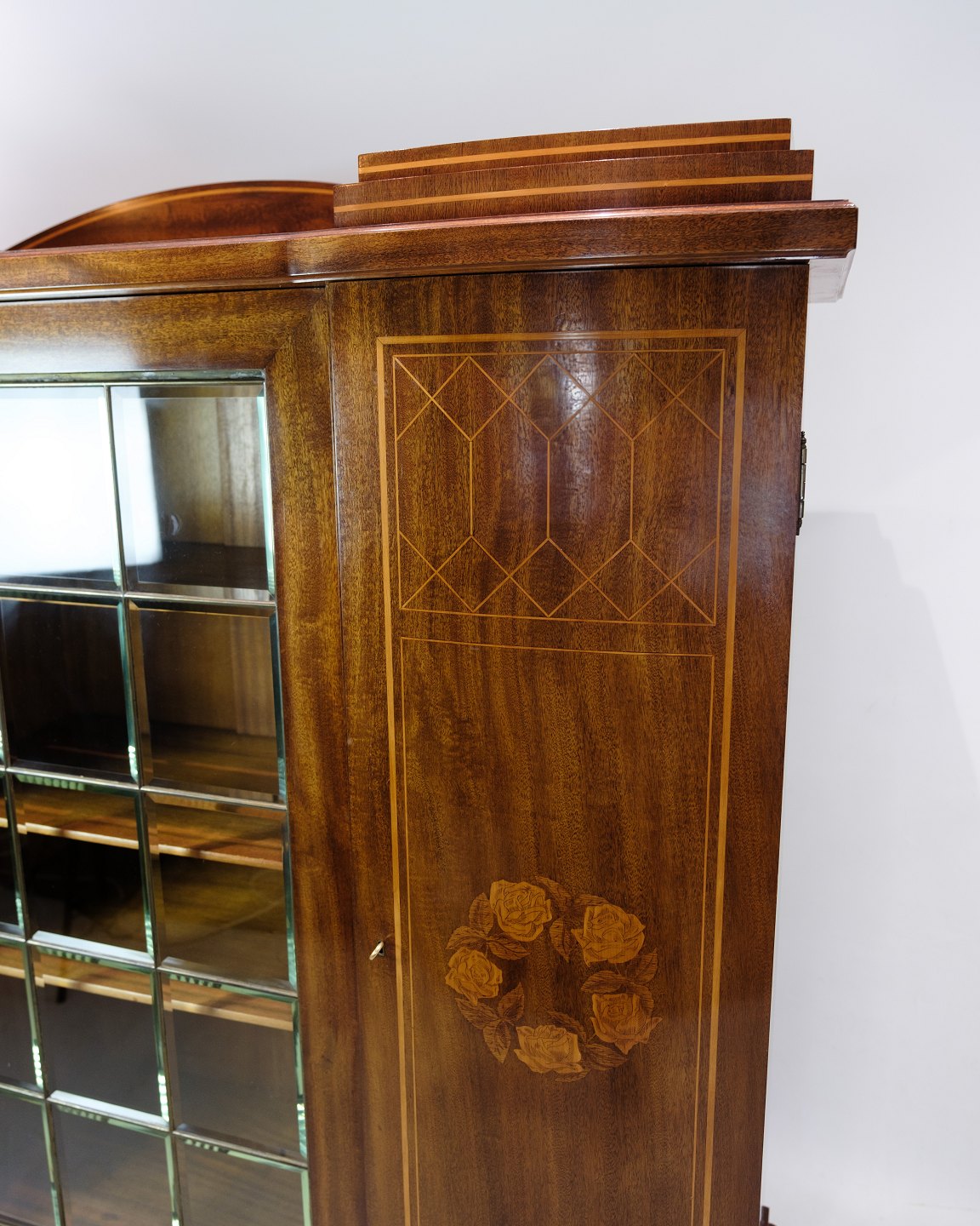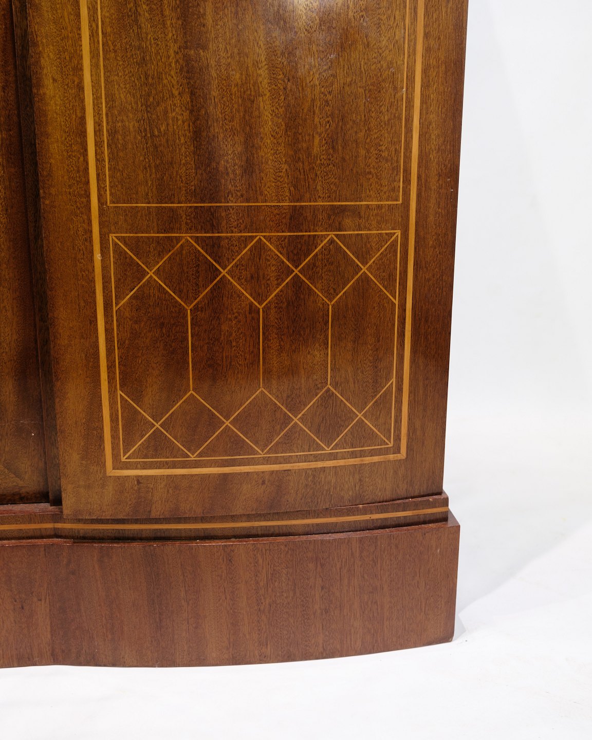 Antikt skab fra 1920'erne, fremstillet i håndpoleret mahogni med detaljeret intarsia af frugttræ. Dette smukke skab kombinerer høj kvalitet af materialer med tidens klassiske håndværk og viser en udsøgt balance mellem æstetik og funktionalitet.