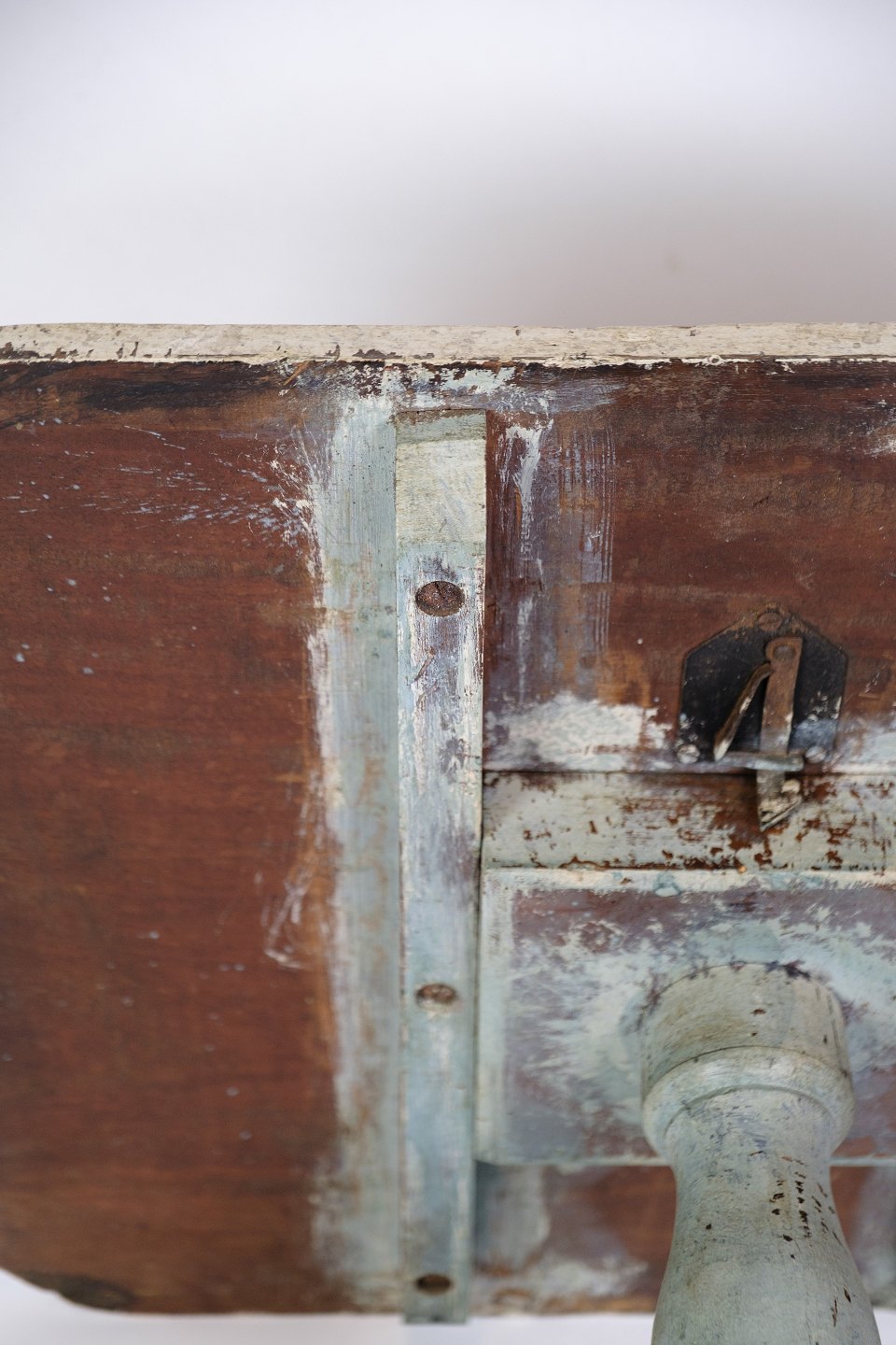 Originalt malet søjlebord/sidebord fra 1840'erne med vippefunktion, udført i blå og grå farver. Dette antikke bord har en praktisk vippefunktion, hvilket gør det ideelt som både et sidebord og som et fleksibelt møbel, der kan foldes op og sættes til side efter behov. Den originale maling i blå og grå nuancer giver bordet et autentisk og tidstypisk udtryk, og patinaen fremhæver dets alder og historiske karakter. Bordet er et godt eksempel på 1800-tallets håndværk, hvor funktion og dekorativt udtryk blev kombineret.