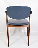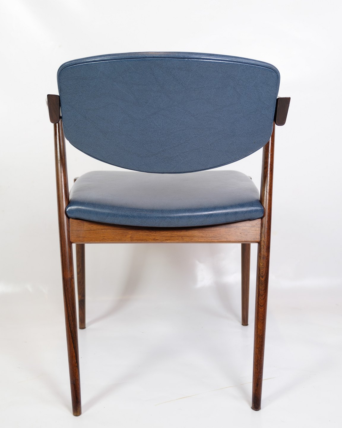 Set of 6 dining table chairs in rosewood with blue leather upholstery, designed by Kai Kristiansen. The chairs have a frame in rosewood, which shows the beautiful grain patterns in the wood, and they are upholstered with blue leather, which is both comfortable and durable.