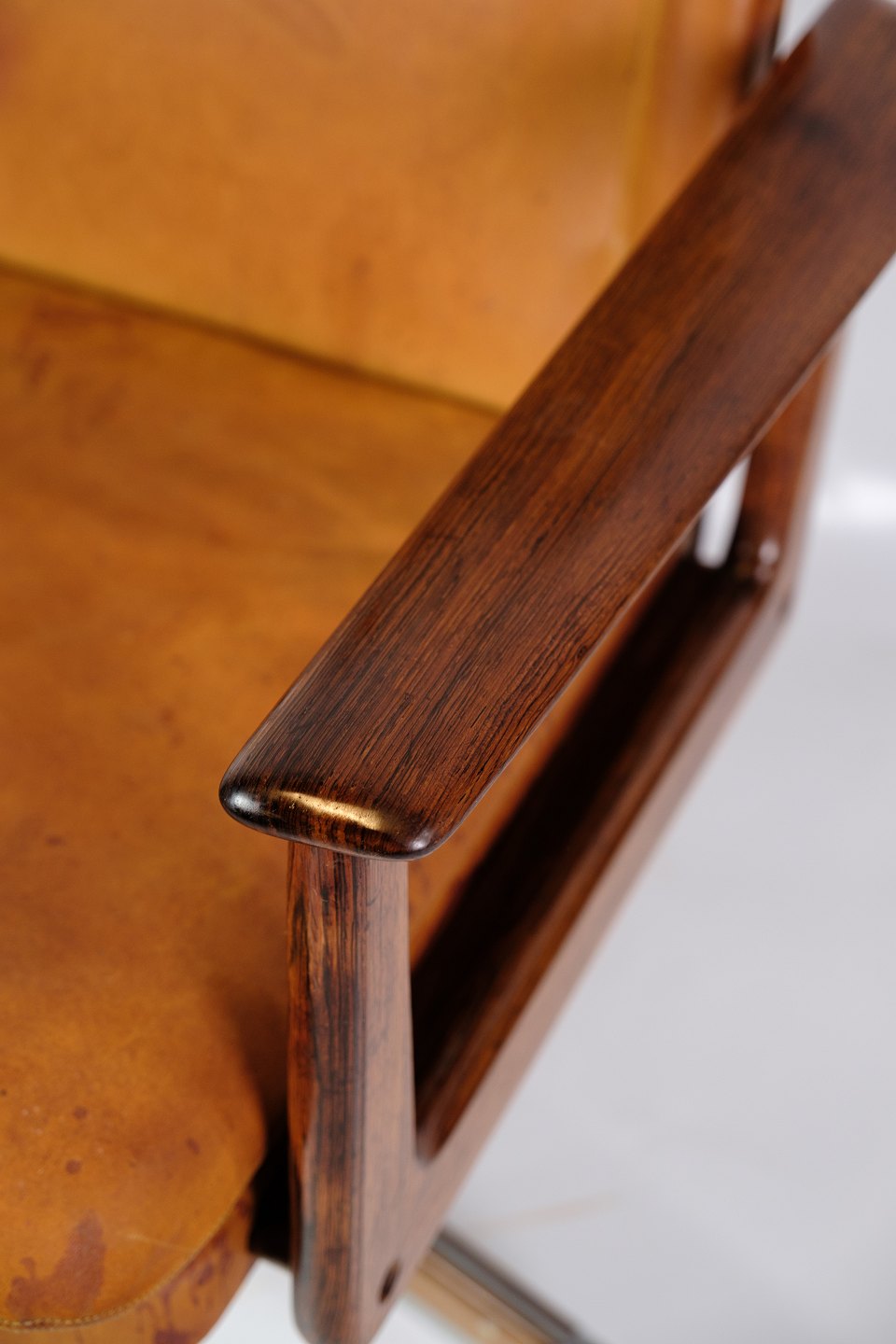 SoldOffice chair, Model 419 with a frame of rosewood, seat and back upholstered in cognac leather. And a five-star base of rosewood and metal, mounted on wheels. Designed by Arne Vodder and manufactured by Sibast Møbler from the 1960s. The office chair is in excellent condition.