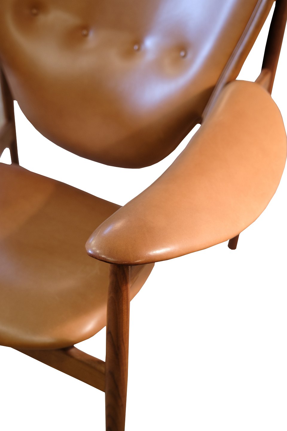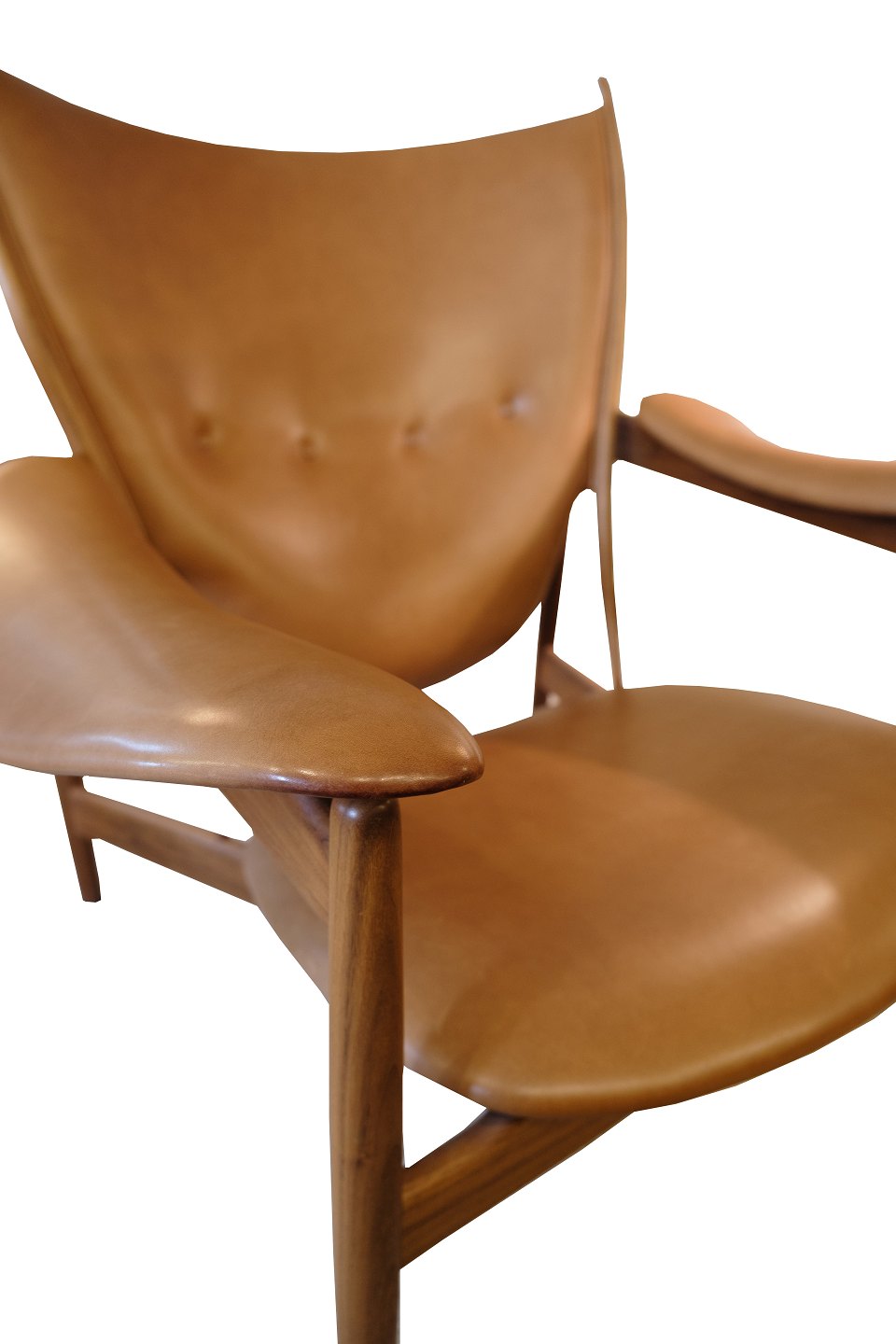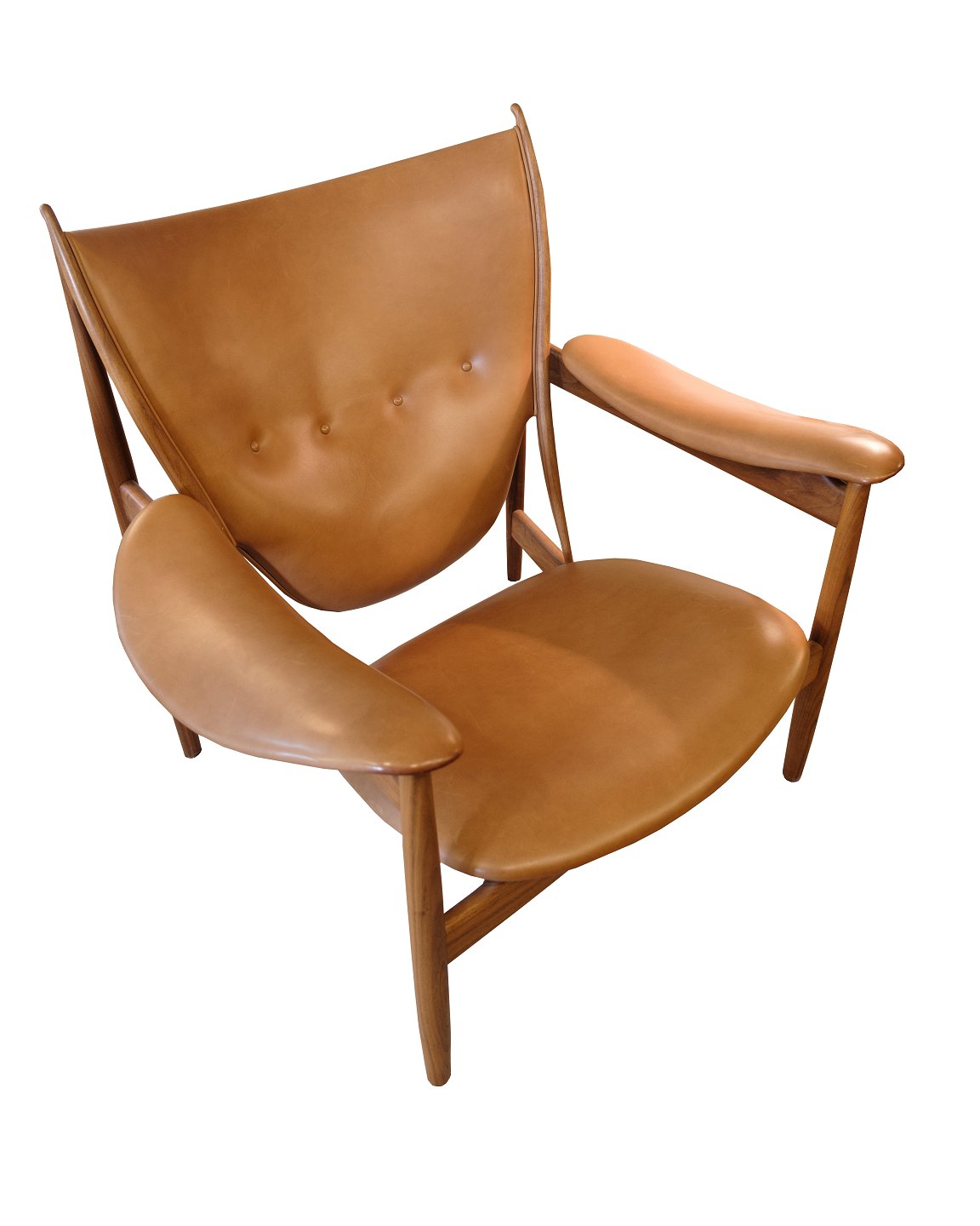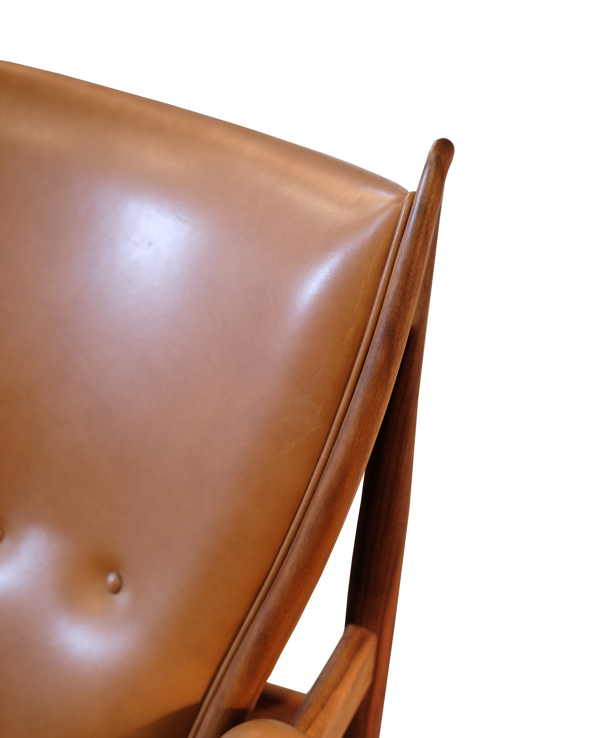 Designed by Finn Juhl in 1949, he invented the chief's chair as we know it today. Produced in walnut wood with cognac leather of the highest quality. The chair has an accompanying stool, which fits the chair in both wood and leather. The chair is made like a sculpture, due to the large size and beautiful details, which is also the reason for the English name "Chieftains Chair".