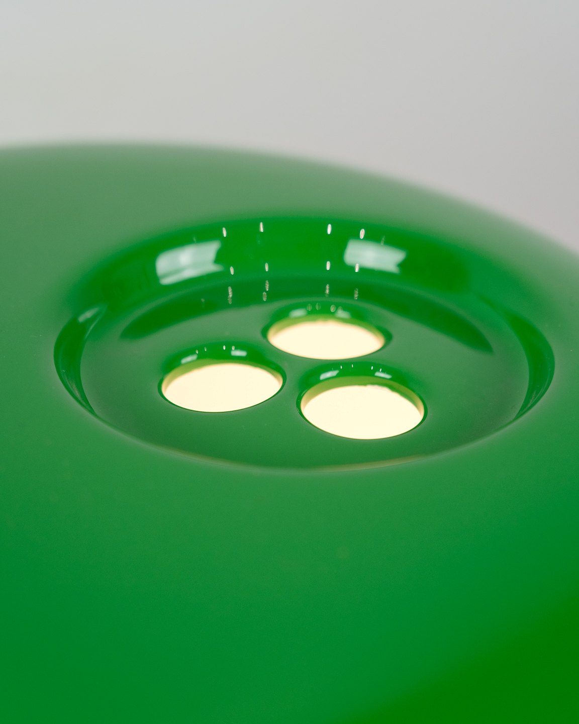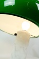 Bordlampe med grøn emaljeret metalreflektor og hvid Carraras marmorfod. lampen blev designet af Achille og Pier Giacomo Castiglioni i 1967. Lampen er fremstillet af Flos og lyset fra lampen skaber en hyggelig stemning.
