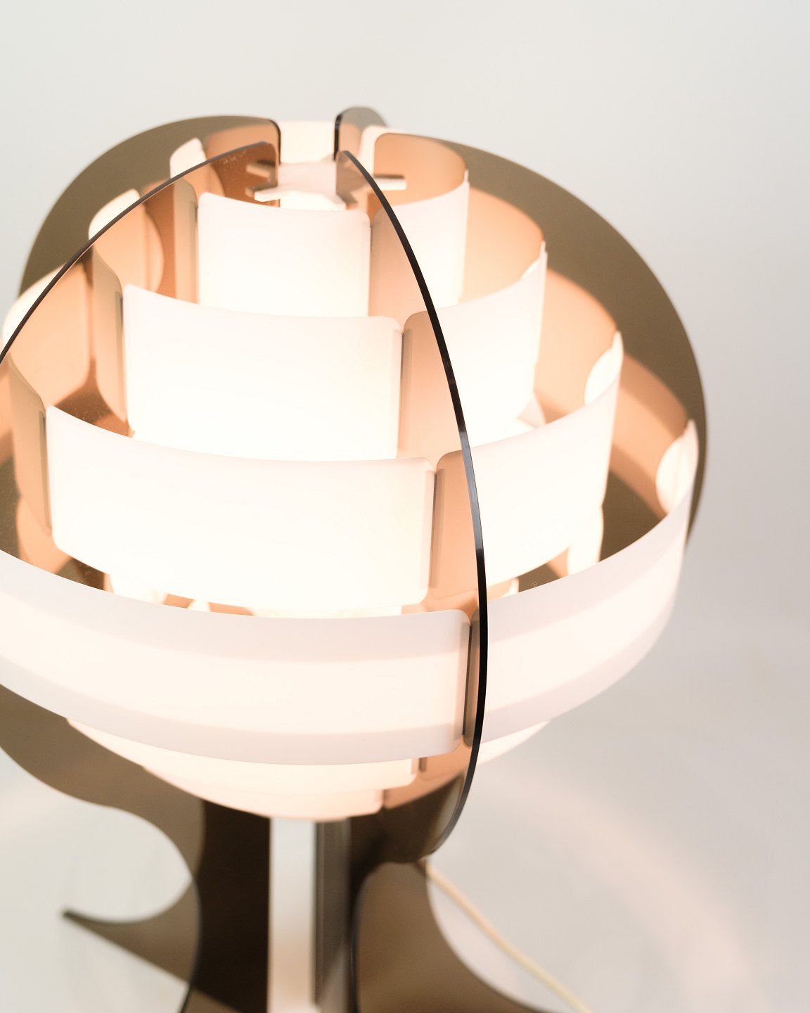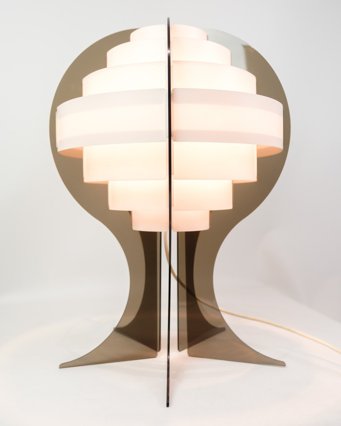 Smoked brown acrylic glass and white acrylic strips make this specially shaped Danish table lamp give off a very special and fantastic light.