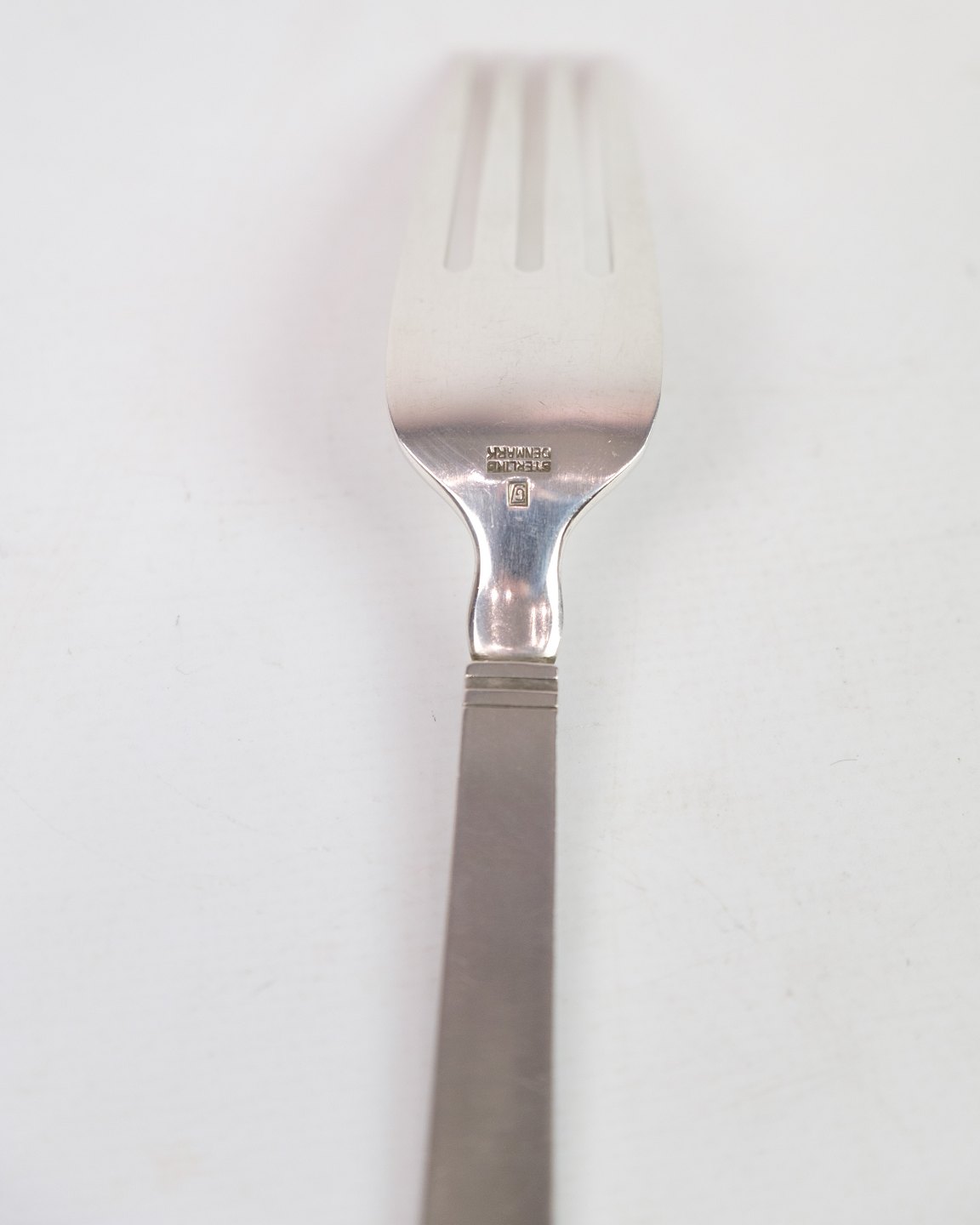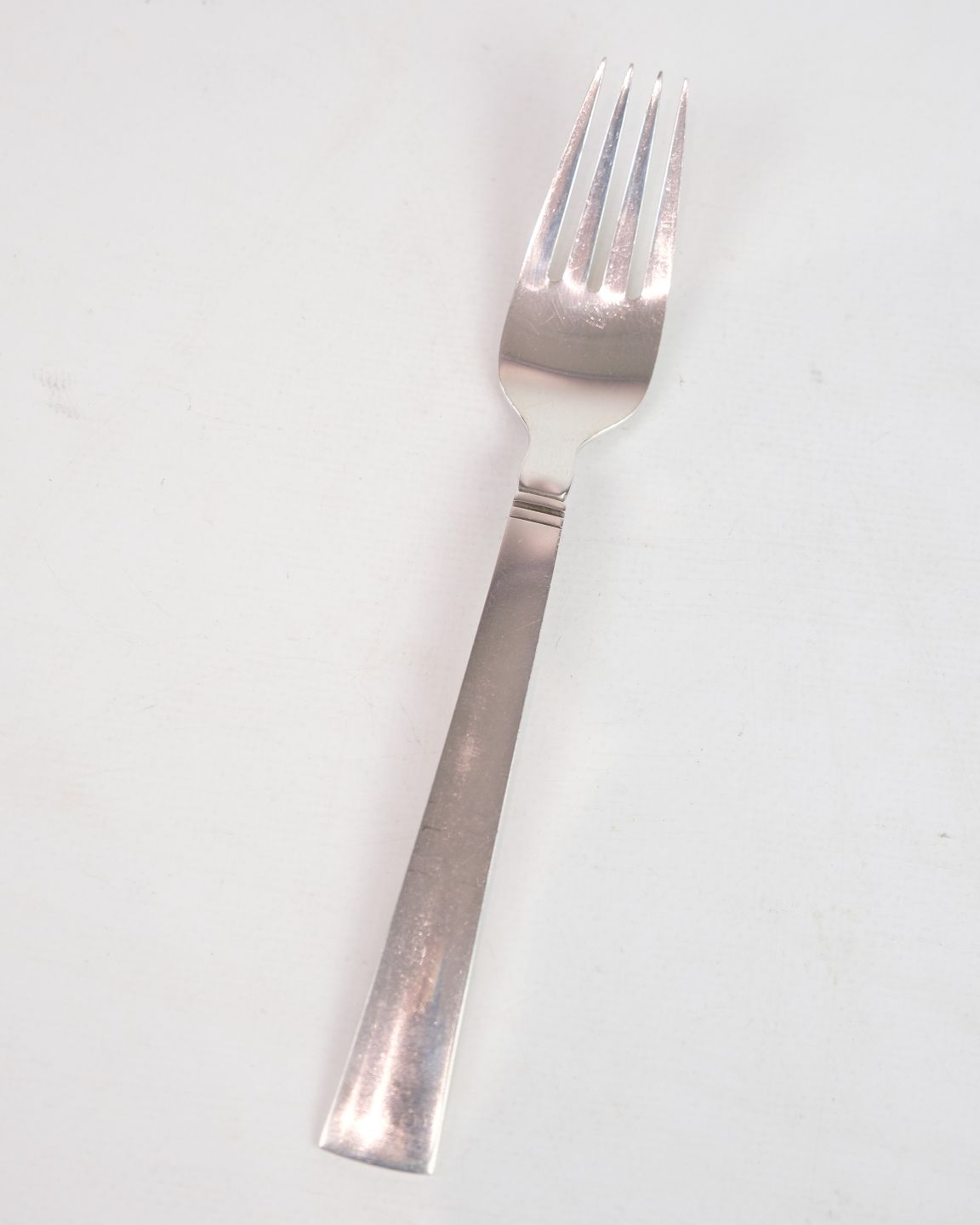 Denne spisegaffel er en del af Georg Jensens "Blok" bestikserie, designet af Just Andersen i 1934. Fremstillet i sterling sølv (925), er gaflen kendetegnet ved sit enkle og funktionelle design, typisk for skandinavisk modernisme. "Blok" serien er kendt for sine rene linjer og tidløse æstetik, hvilket gør den velegnet til både hverdagsbrug og formelle anledninger.