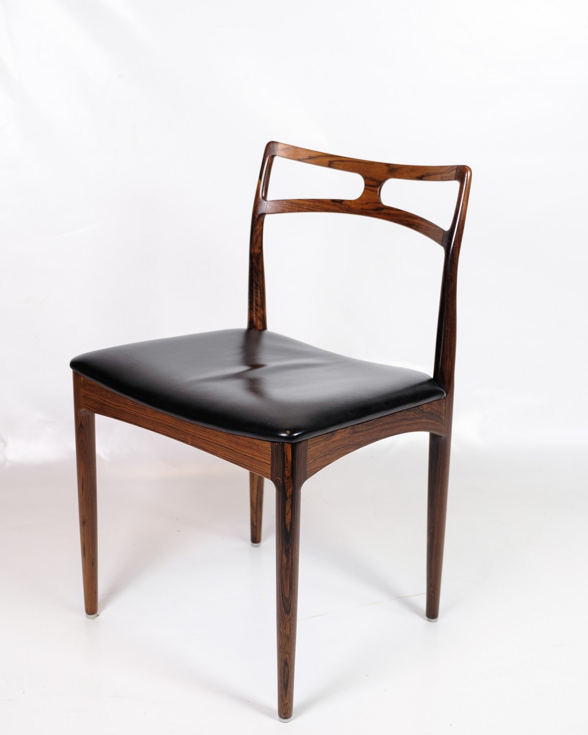 Set of 6 dining chairs, model 94, designed by Johannes Andersen in the 1960s and manufactured by Christian Linneberg Møbelfabrik. The chairs are made of rosewood with beautiful grain patterns and have seats upholstered in black leather. The design of the chairs is characterized by their slender, round legs and the ribbon-shaped, slightly curved backrest.