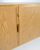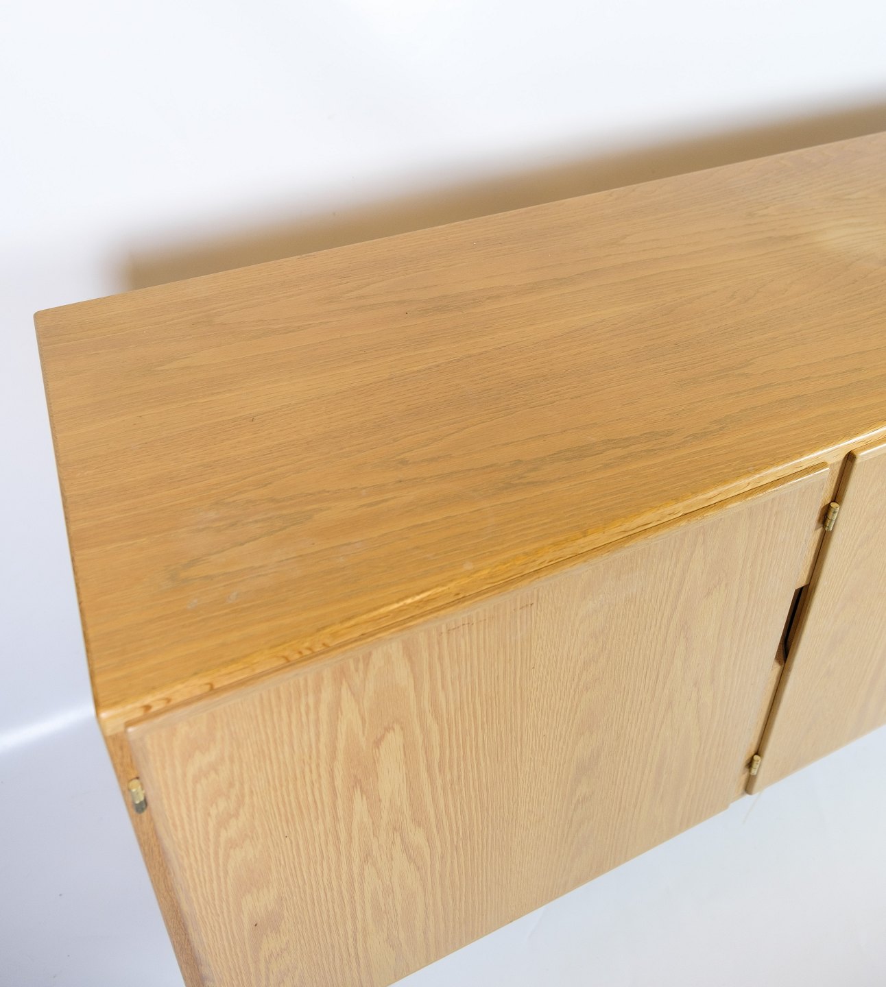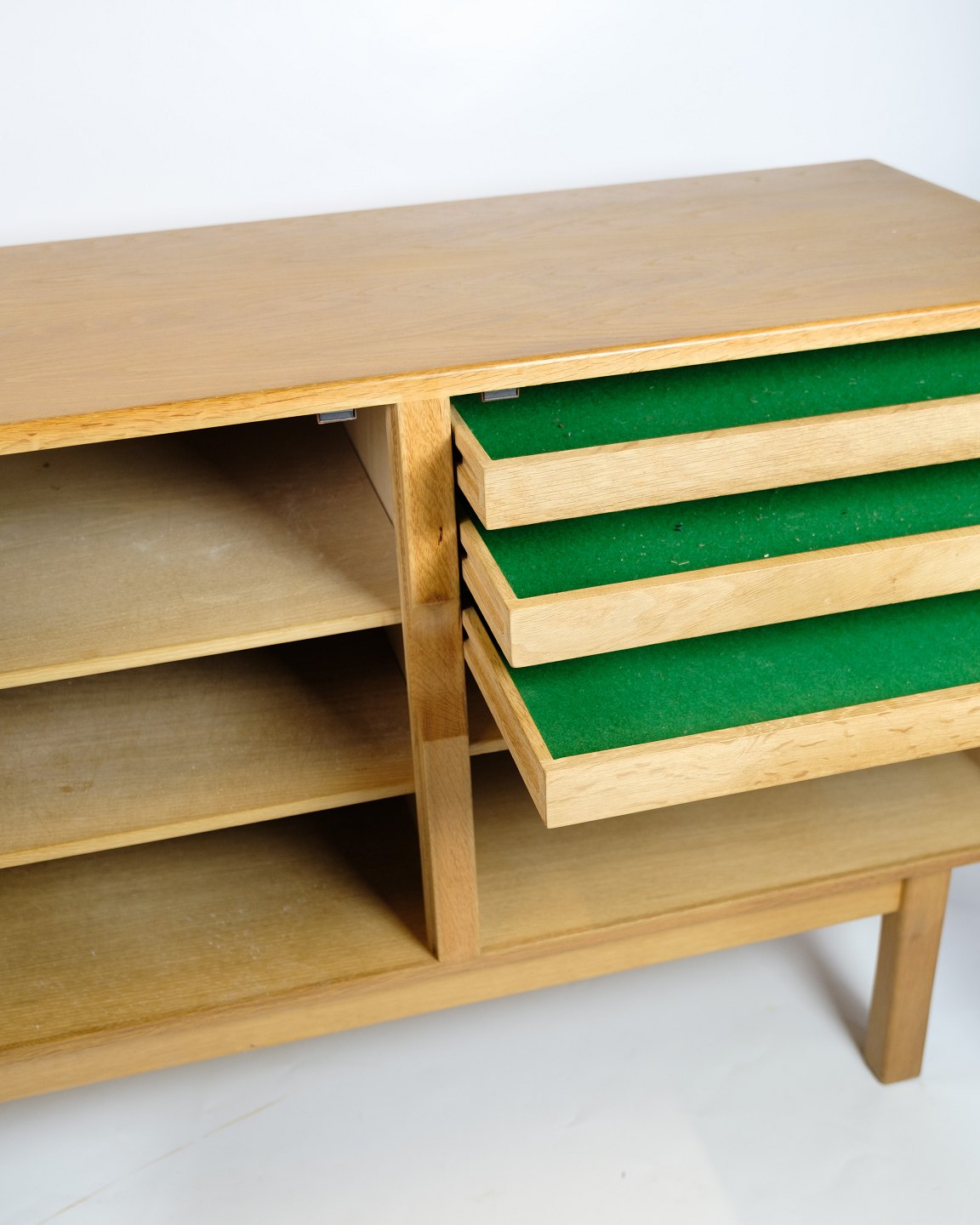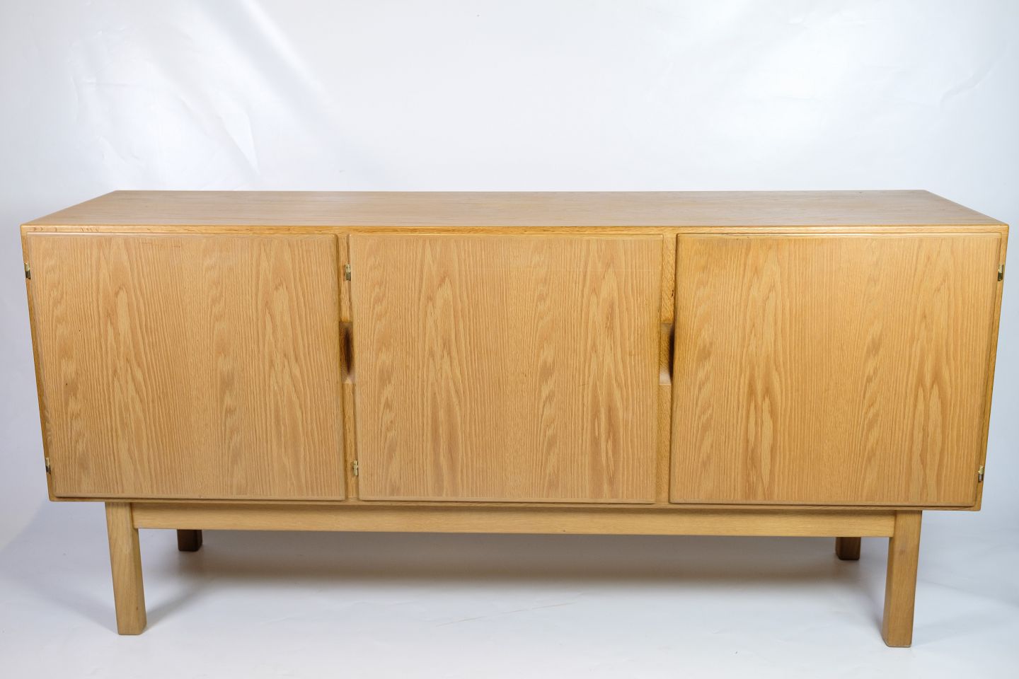 Skænk i lys eg fra 1960'erne, udført i dansk design. Skænken har tre låger, der åbner op til rummelige opbevaringsrum med hylder og tre udtræksskuffer, ideelle til opbevaring af mindre genstande. Det enkle og funktionelle design kombinerer rene linjer med kvalitetsmaterialer, hvilket gør skænken både praktisk og stilfuld.