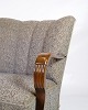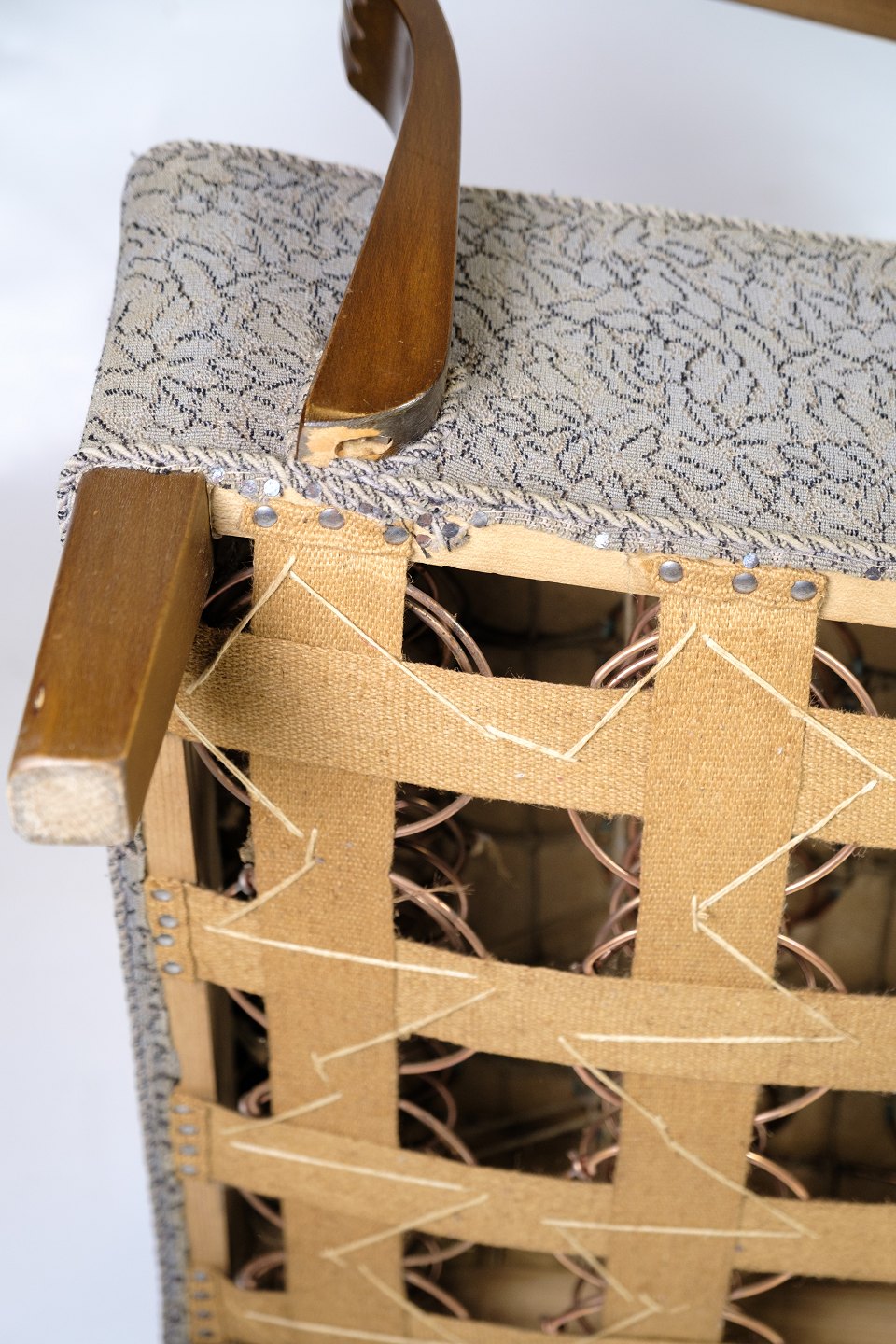 Sæt af 2 lænestole fra 1960'erne med stel og armlæn i poleret mørkt træ. Stolene har en høj, polstret ryg og brede armlæn, der giver god støtte. De er betrukket med blomstret stof og står på solide, lige træben. Et klassisk dansk design, der kombinerer træ og polstring i en funktionel og enkel stil.
