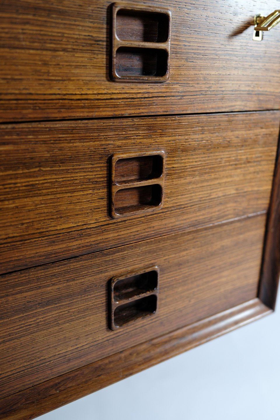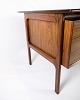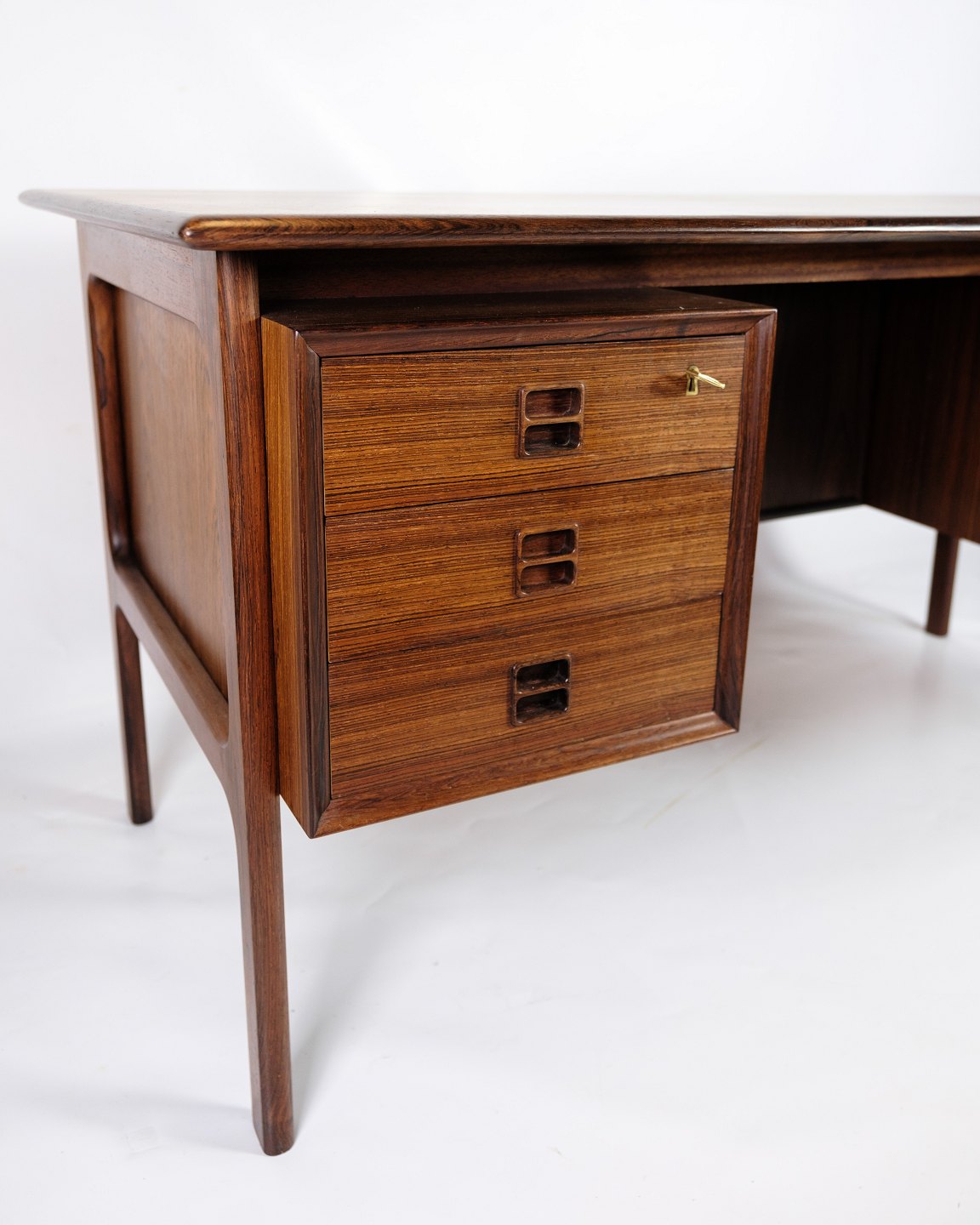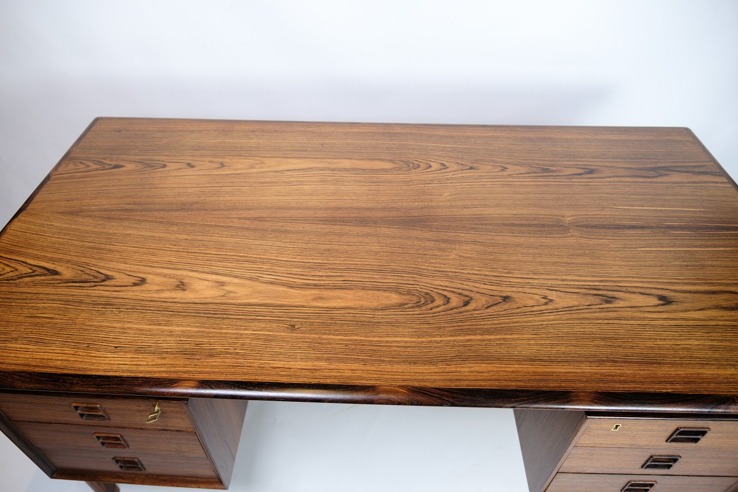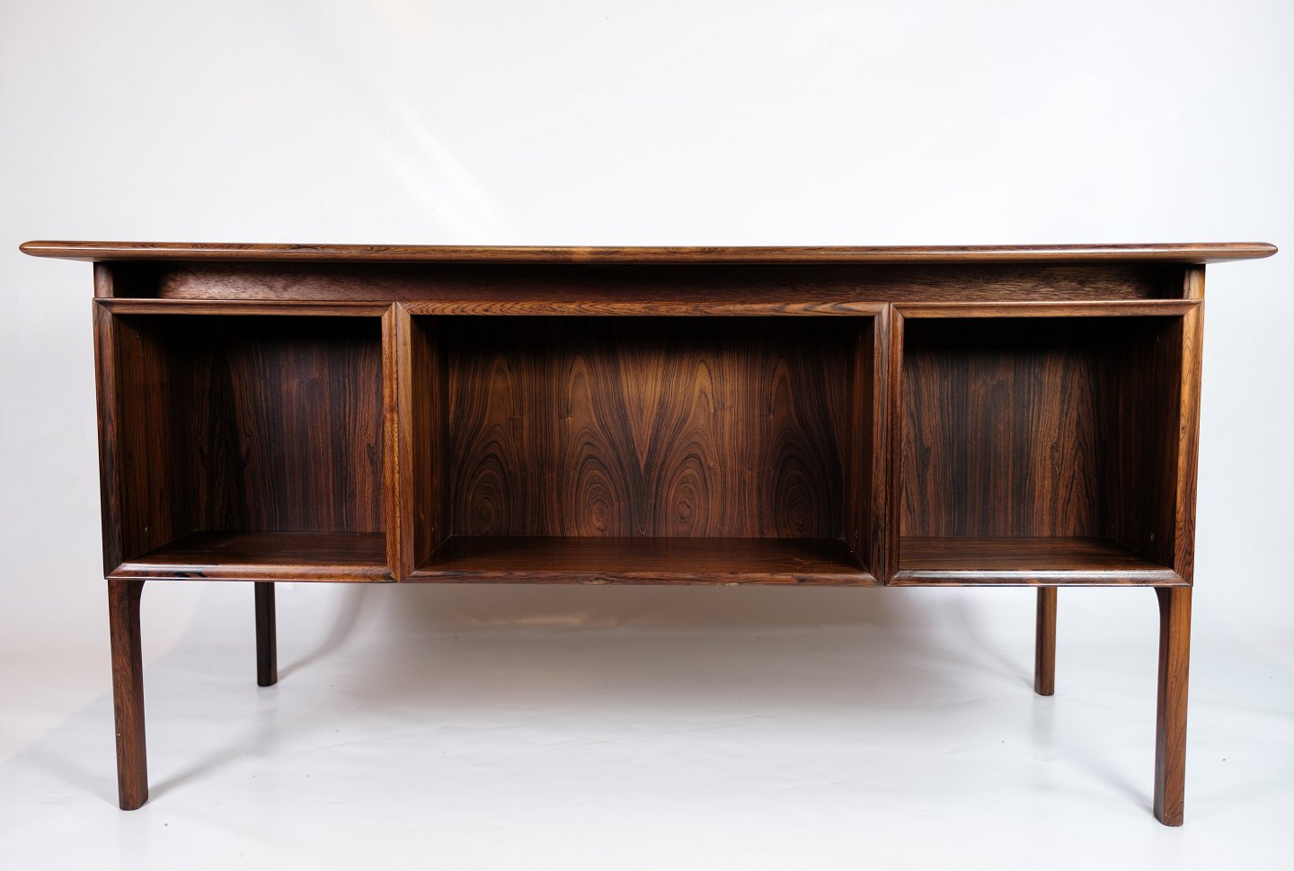 SolgtFritstående skrivebord designet af Erik Brouer og fremstillet af Brouer Møbelfabrik. Skrivebordet er udført i palisander og har 6 rummelige skuffer, der giver gode opbevaringsmuligheder. Det fritstående design betyder, at skrivebordet også er smukt fra bagsiden, hvilket gør det ideelt til placering midt i rummet.