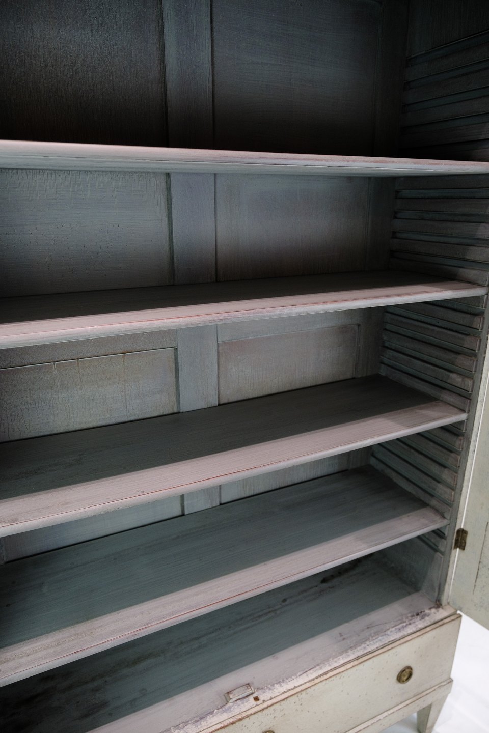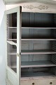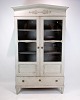Glasskab med smuk gråmalet udsmykning fra den gustavianske periode år 1810. Skabet har en stor skuffe en bunden og 4 store indvendige hylder med meget opbevaringsplads. Skabet er udsmykket med messing håndtag og låse. Det er et meget enkelt og minimalistisk skab fra perioden med rene linjer og kanter.