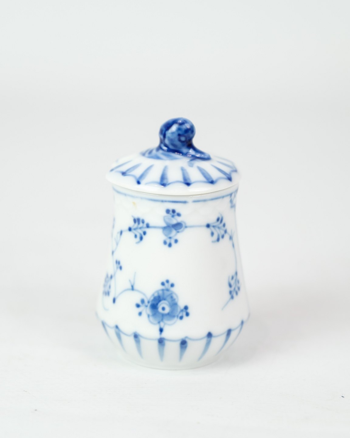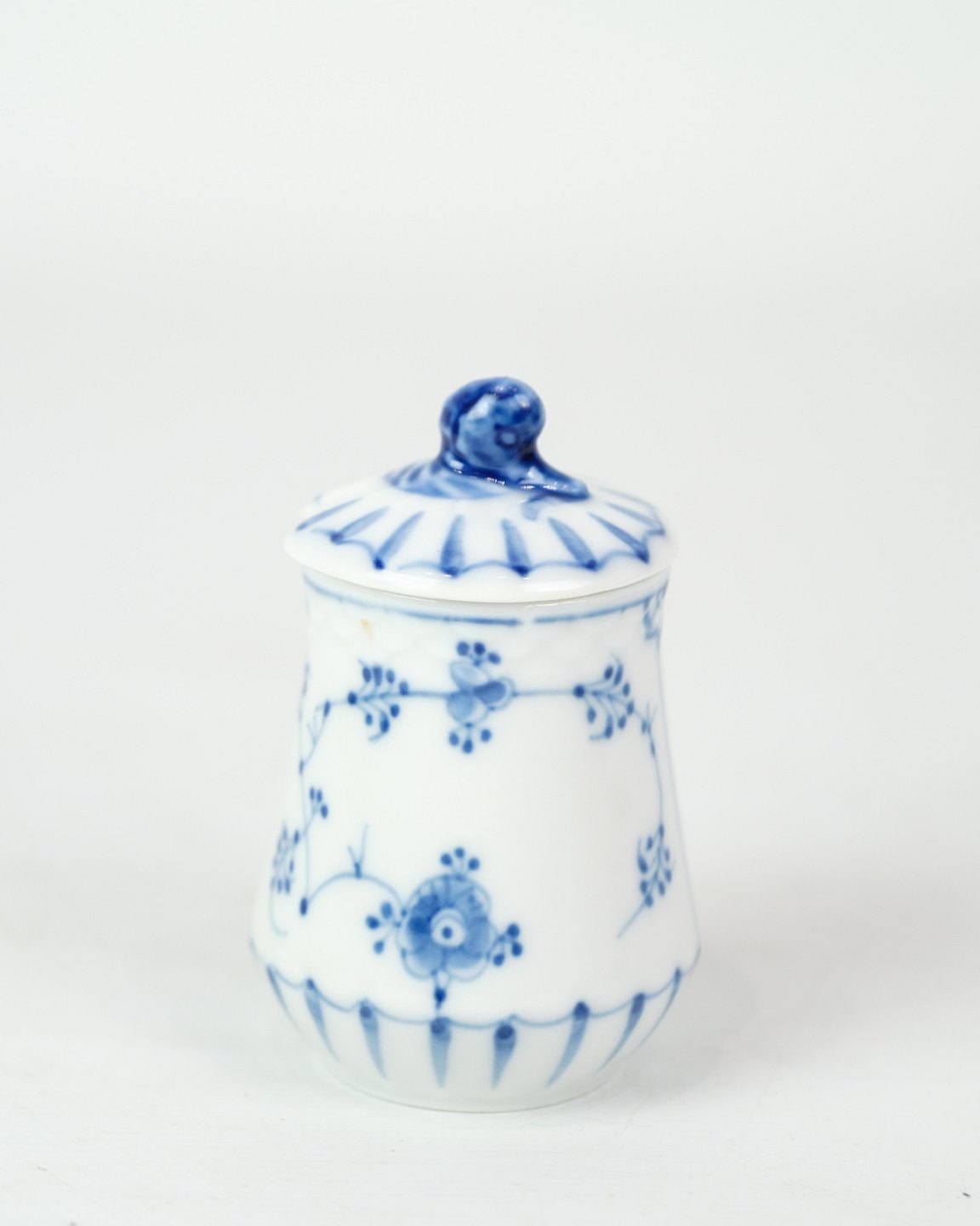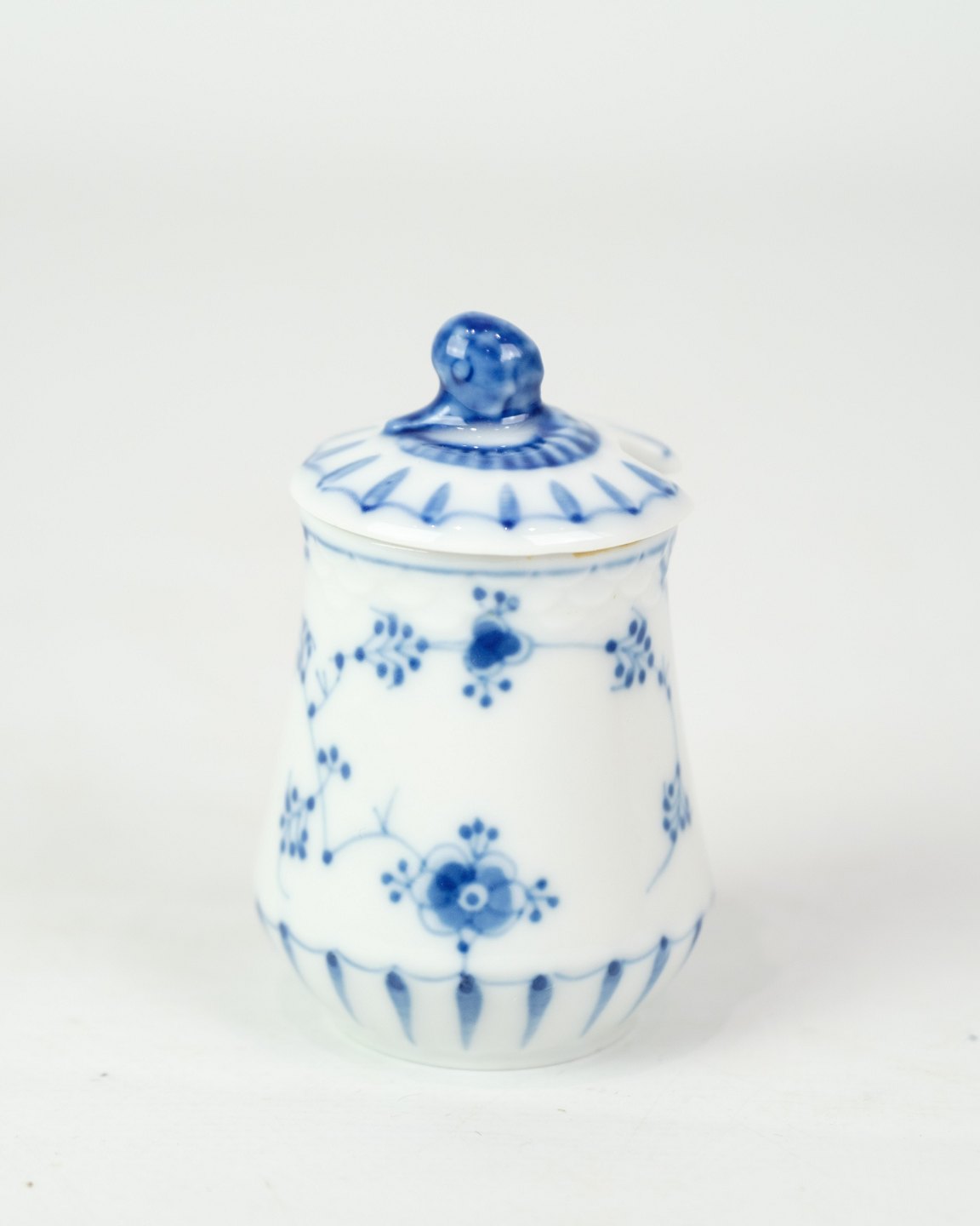 Mustard jar no. 52c from Bing & Grondahl. Made of porcelain with classic blue painted blue fluting decoration.