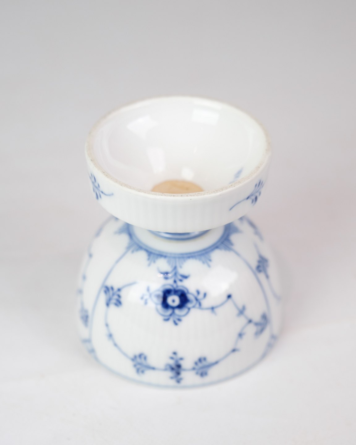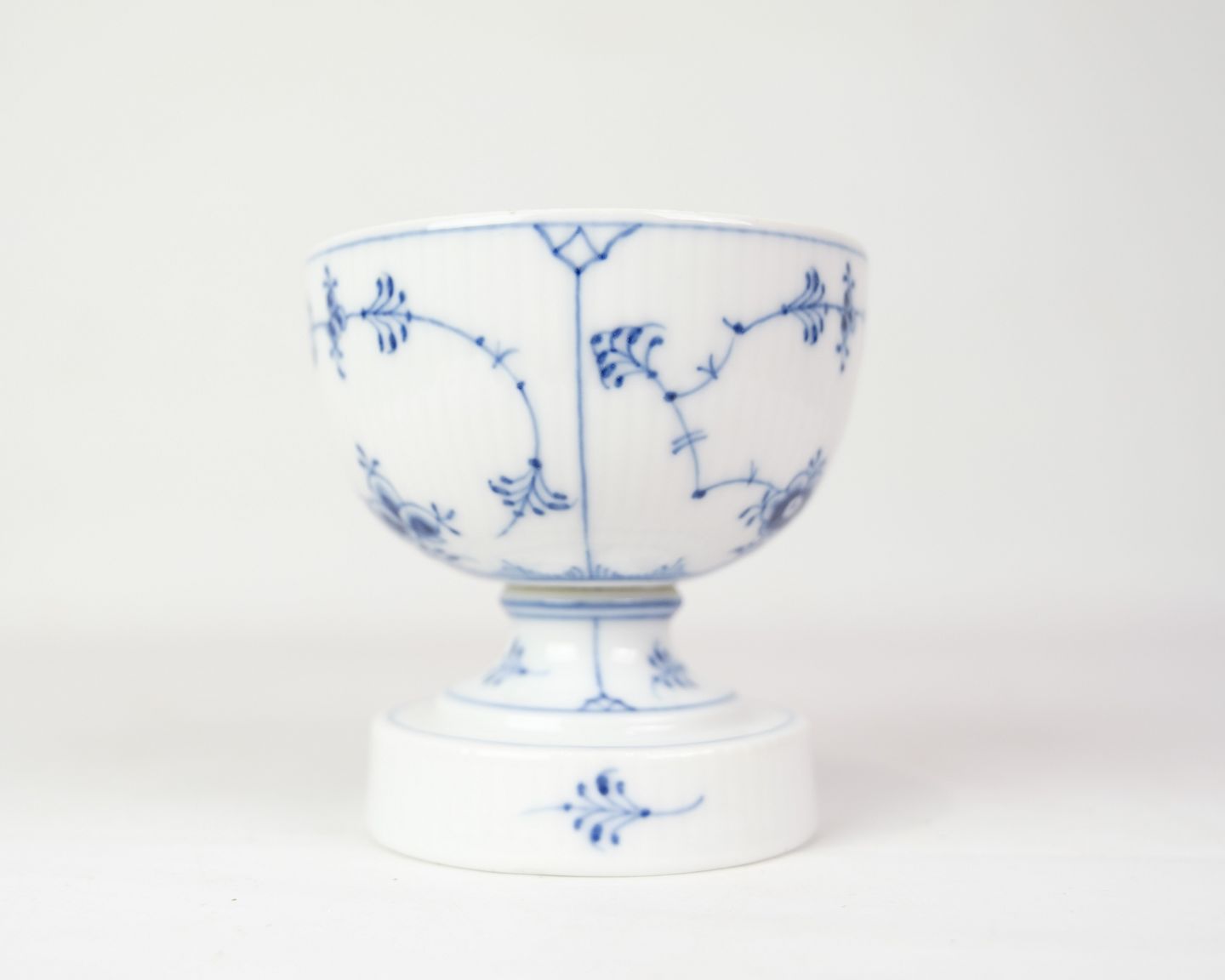 Small bowl on foot marked 1/2124 from Royal Copenhagen. Made of porcelain with classic blue fluting design. Hand painted in blue decoration.