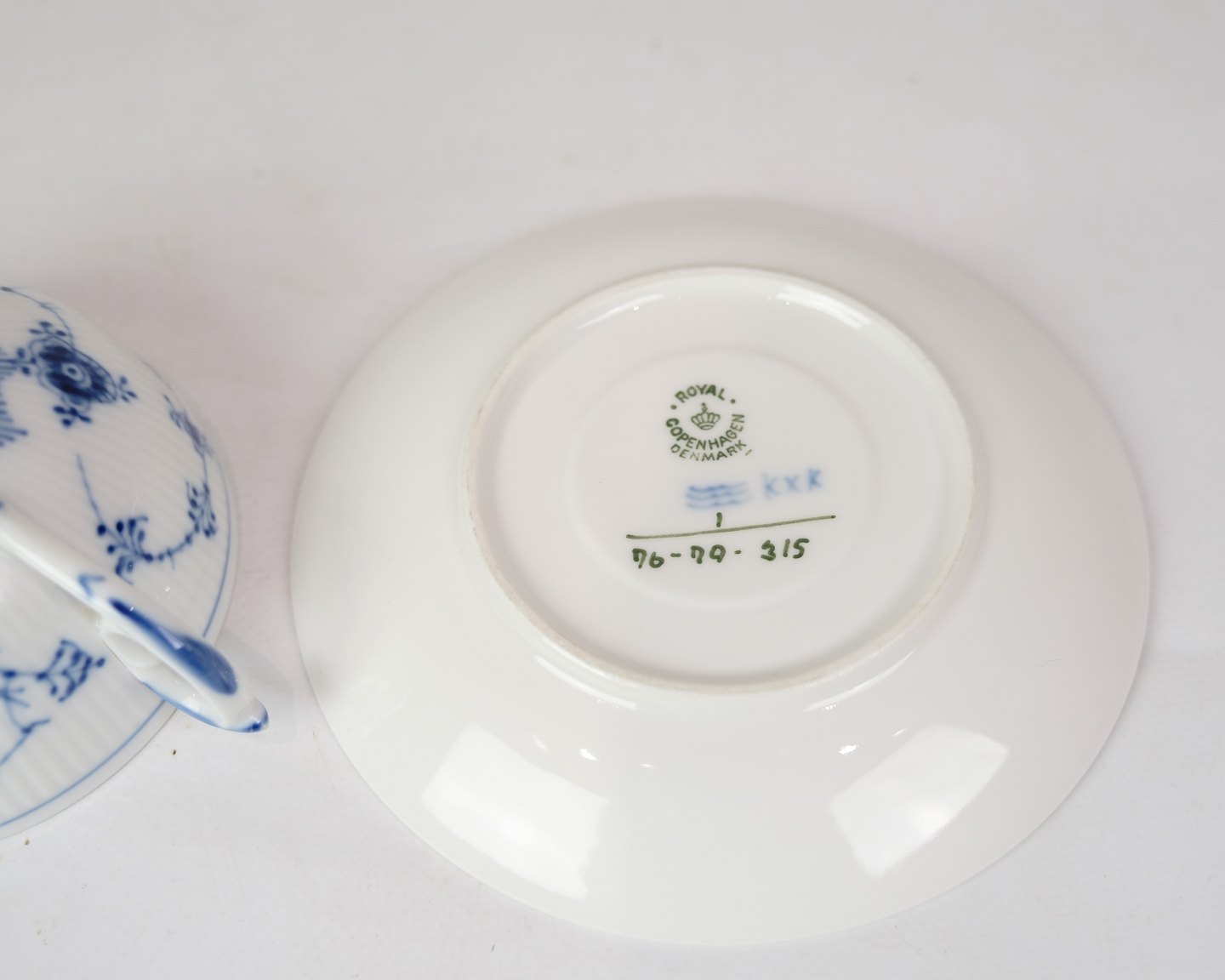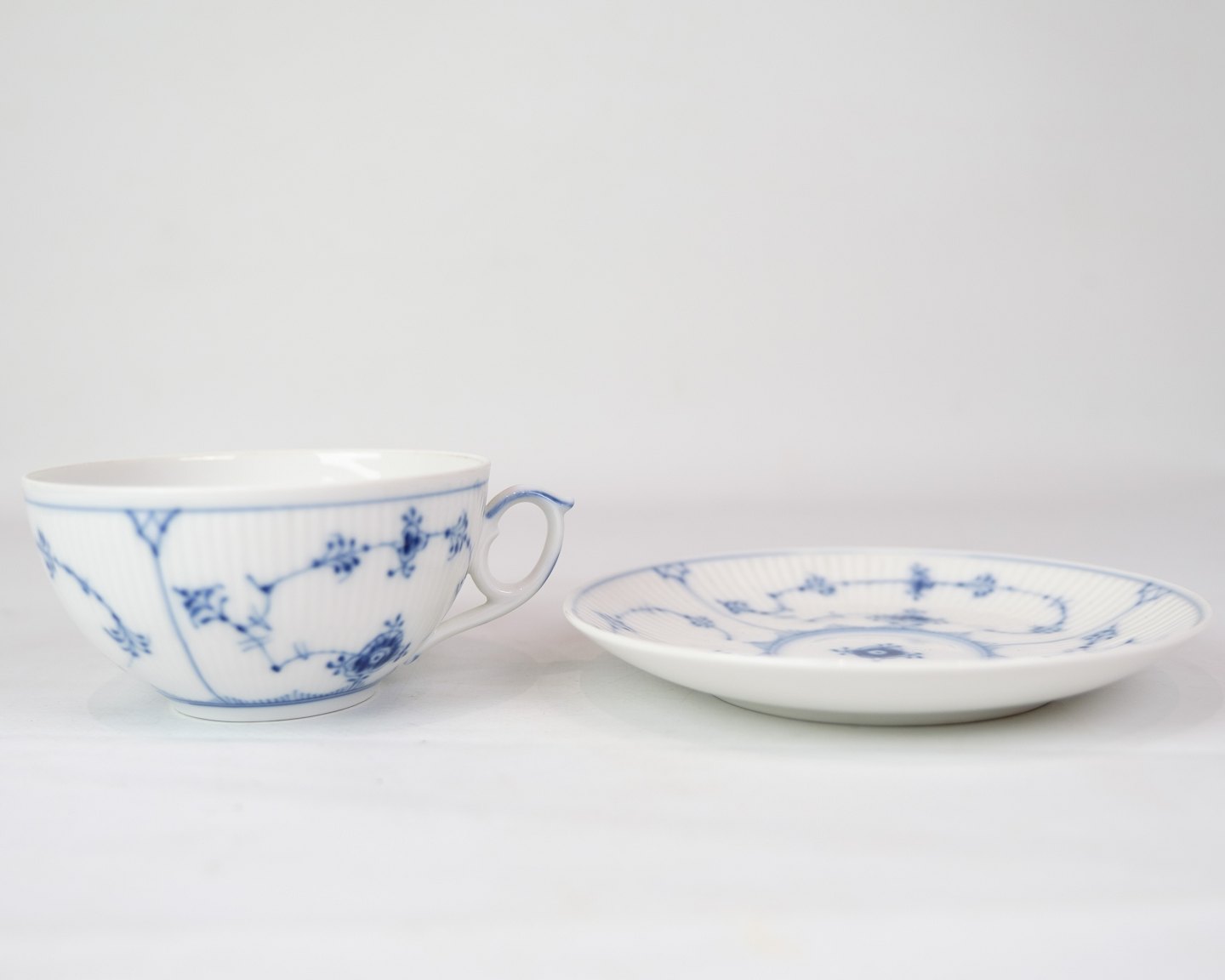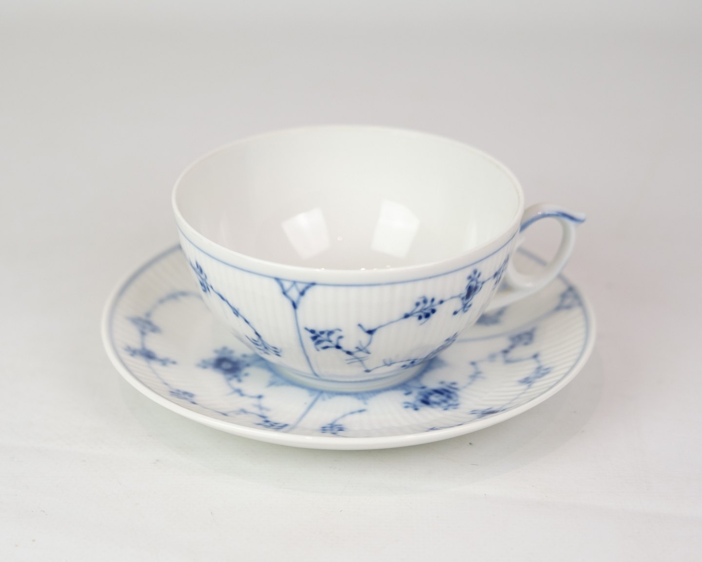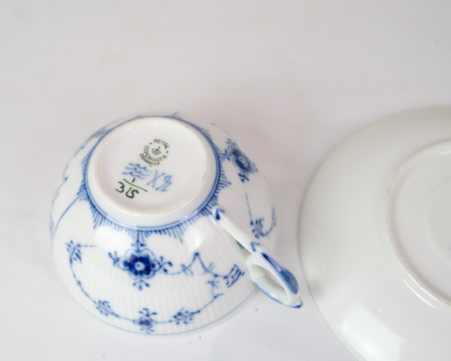 Large teacup with matching saucer marked 1/315 from Royal Copenhagen. Made of porcelain with classic blue fluting design.