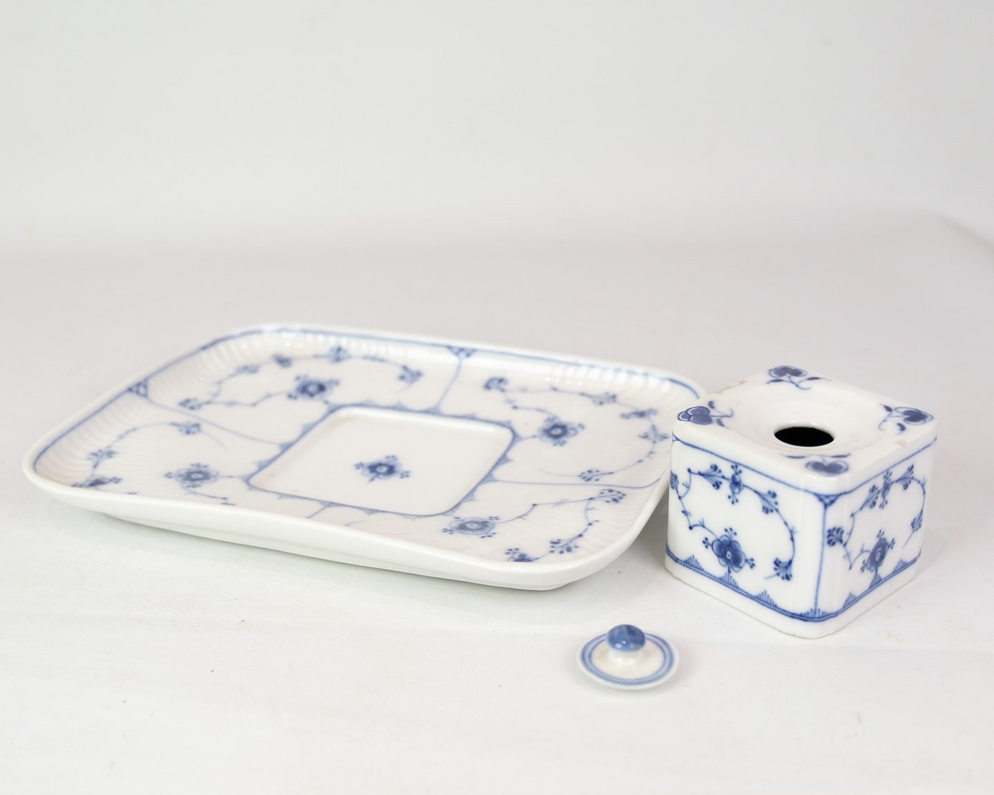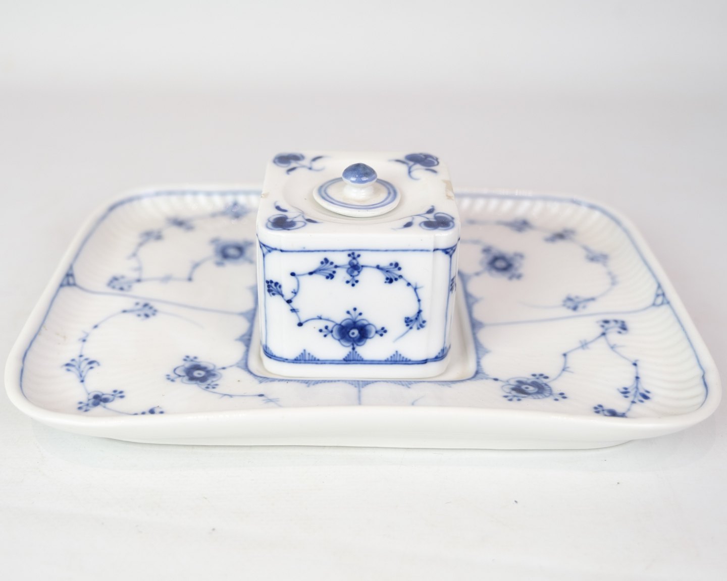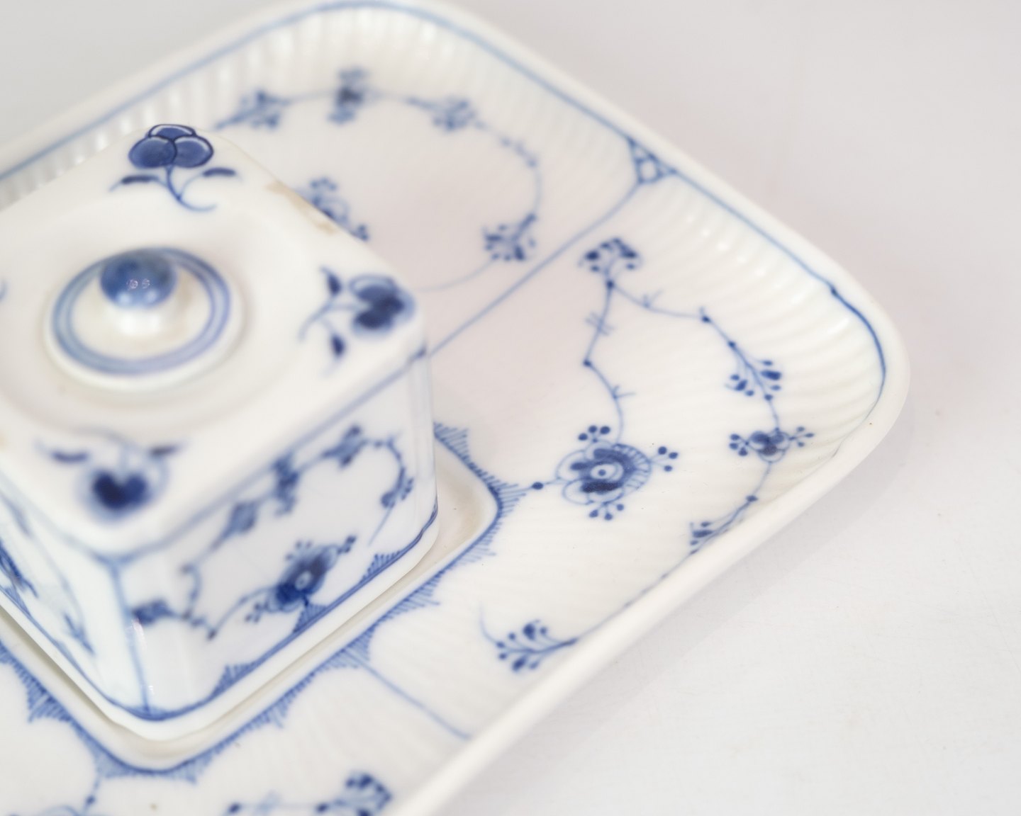 RC writing set in the blue fluting pattern with model no. 128. With regard to the factory mark from the Royal Porcelain Factory, it appears that this item was manufactured between 1898 and 1923. Is in very good condition with accompanying lid.