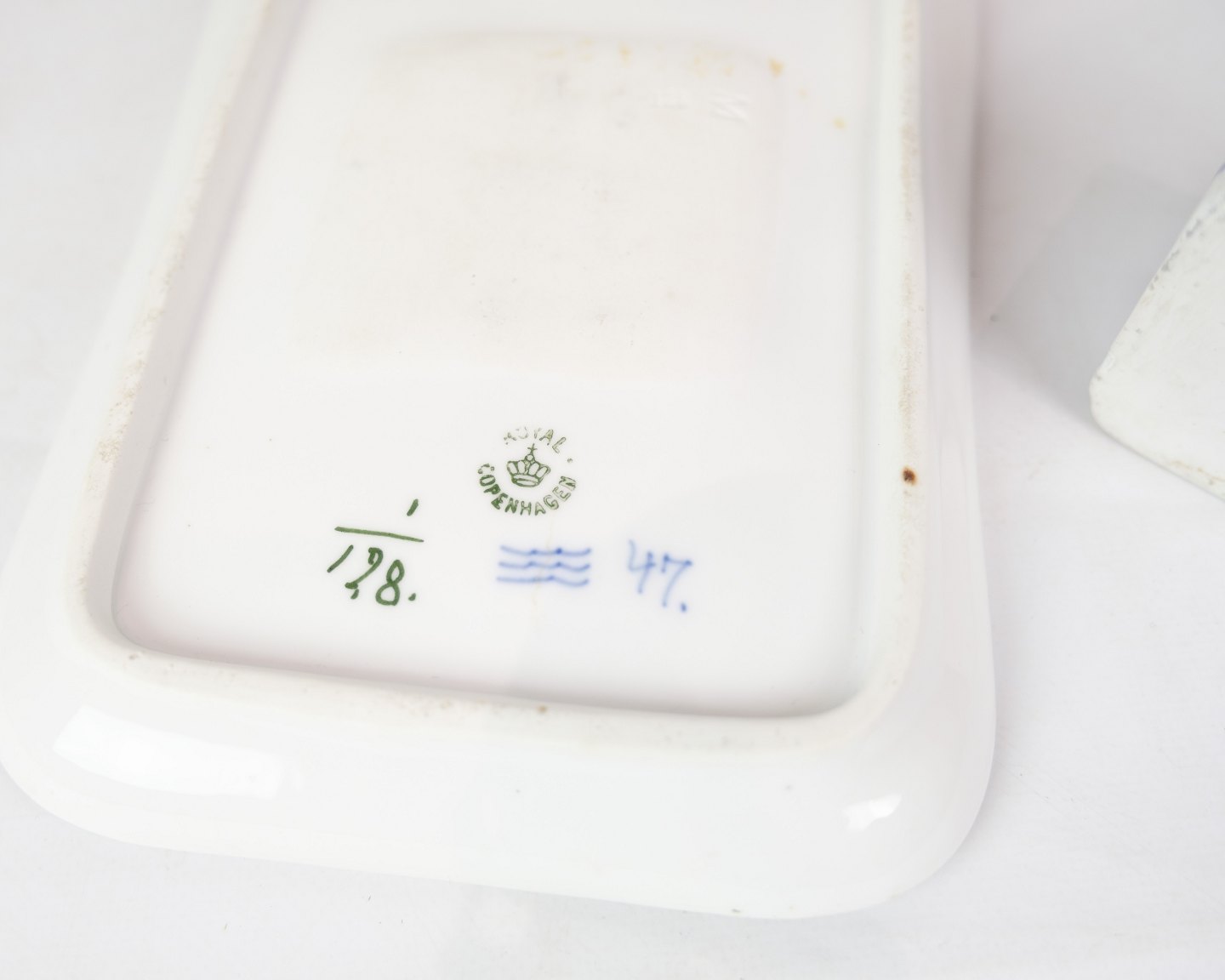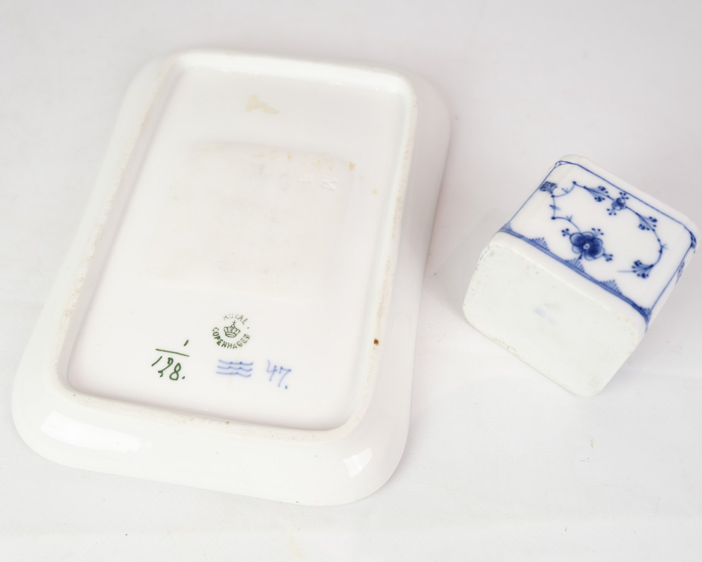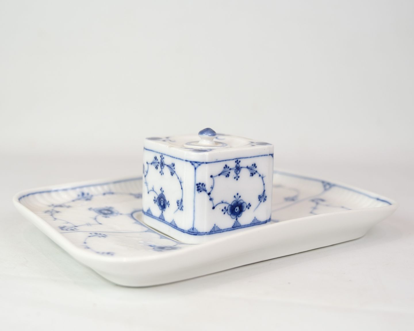 RC writing set in the blue fluting pattern with model no. 128. With regard to the factory mark from the Royal Porcelain Factory, it appears that this item was manufactured between 1898 and 1923. Is in very good condition with accompanying lid.
