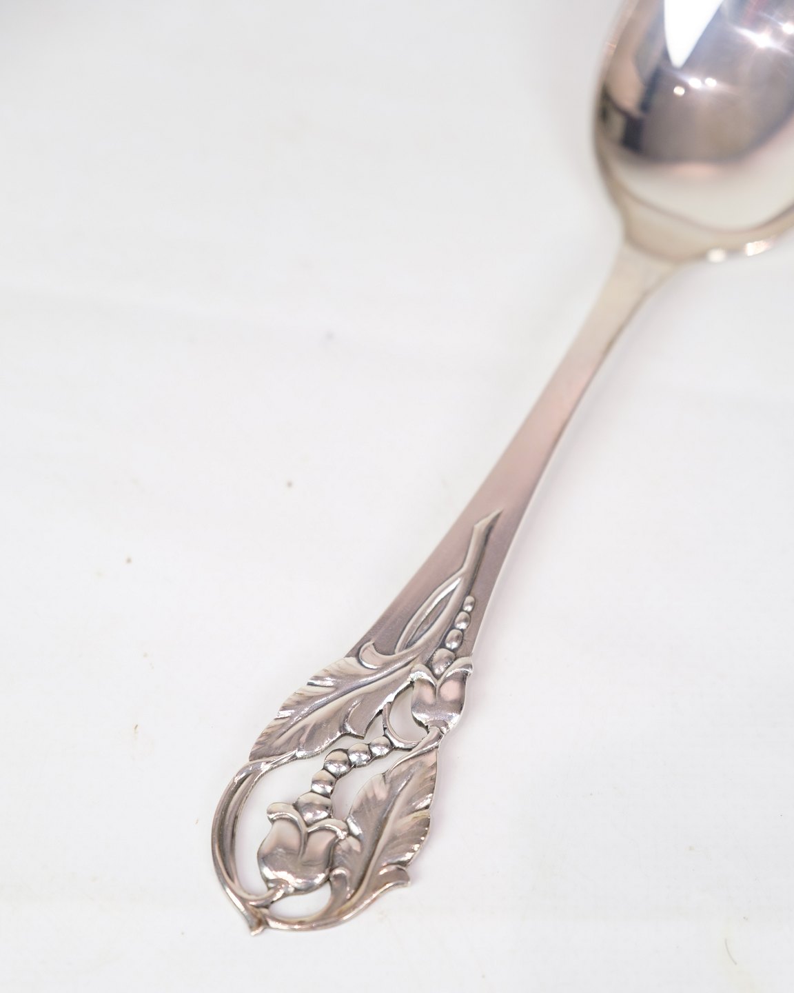 Hand-forged silver spoon with the stamp of C. BH and made of three-tower silver. The handle is decorated with elegant leaf and flower ornamentation