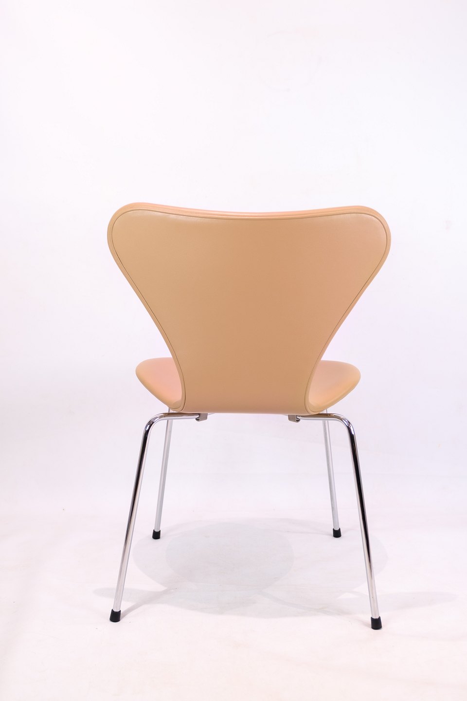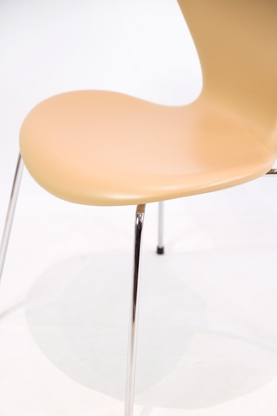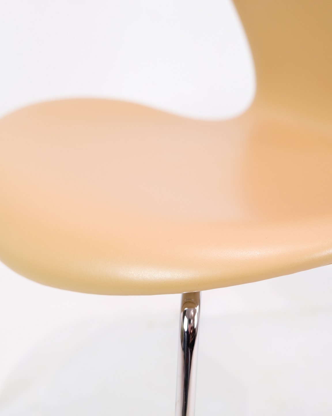 The Seven Chair model 3107, designed by Arne Jacobsen and produced by Fritz Hansen. Newly upholstered in cream-colored Elegance leather with a chrome frame.