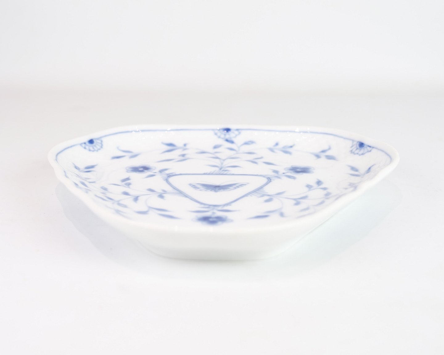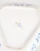 Trekantet fad nr. 4 fra Bing & Grøndahl. Udført i porcelæn med håndmalet sommerfuglmotiv. Unik form, velegnet til servering eller som dekorativt element. Stemplet under bunden.
