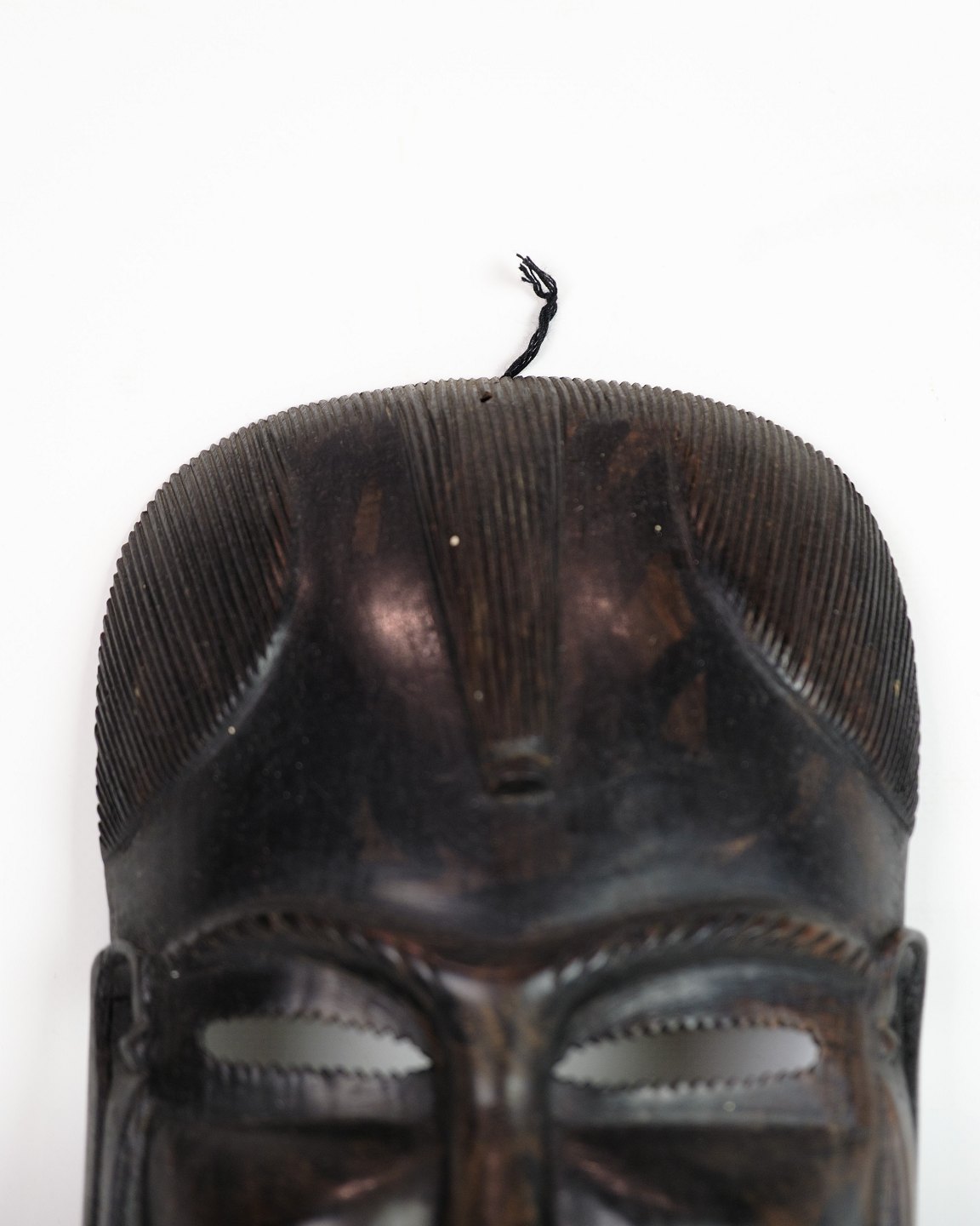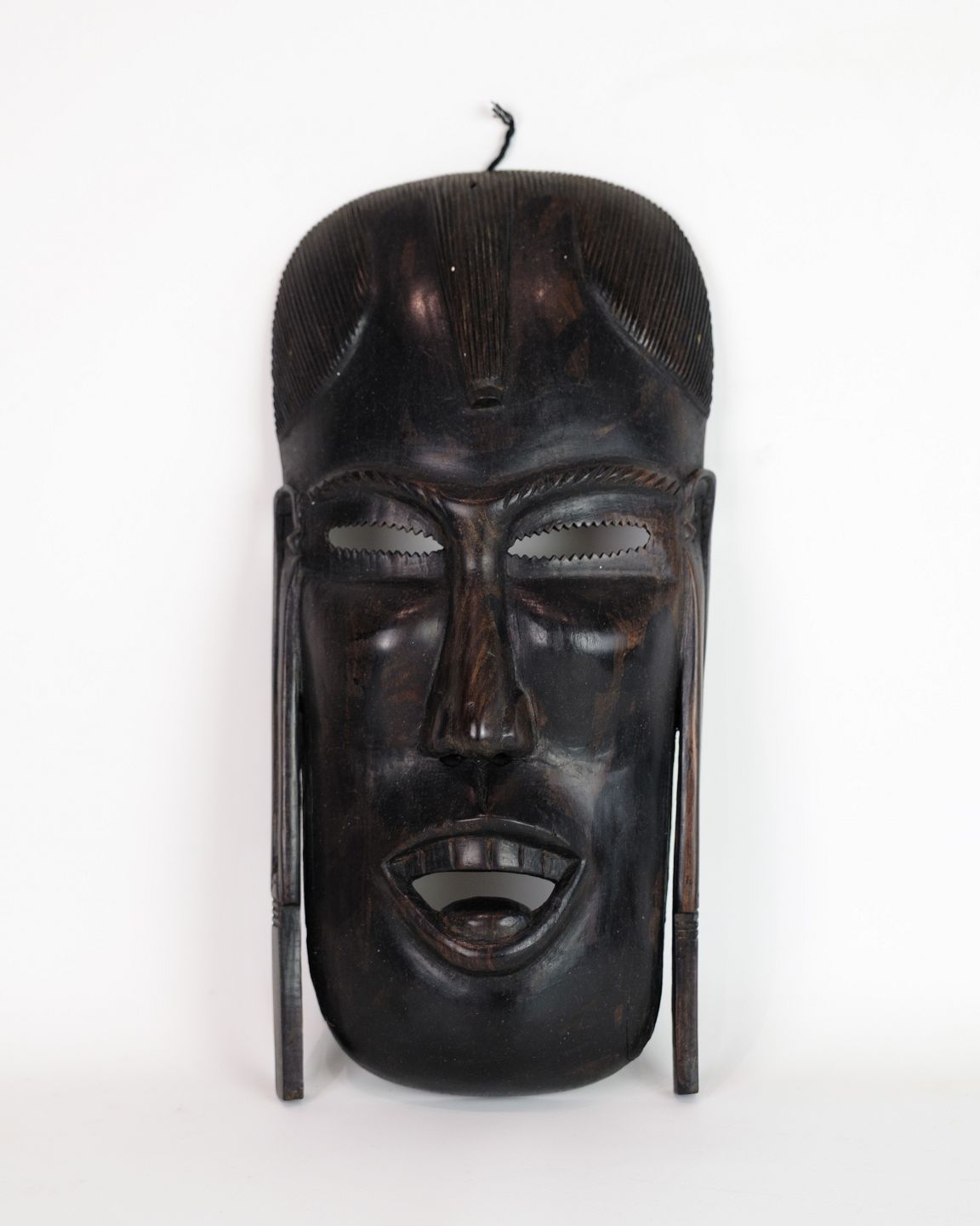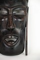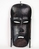 Afrikanische Maske, handgeschnitzt aus dunklem Holz, typisch für traditionelle Zeremonien und Rituale in West- und Zentralafrika. Die Maske stellt häufig Geister oder Ahnen dar und ist ein authentisches Beispiel afrikanischer Handwerkskunst.