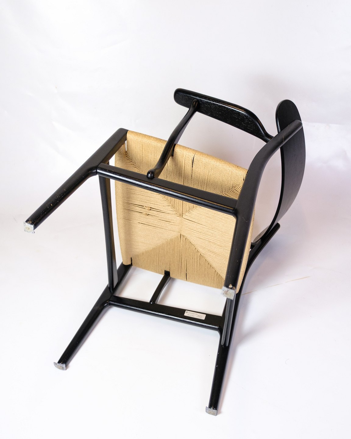 SoldArmchair with arms, model name CH26 made of black oak with light paper yarn made by Carl Hansen & Son. The CH26 chair is a design by Hans J. Wegner from the 1950s and is actually one of the more complicated to produce based on the curved shapes. During the release of the chair, which was also Wegner's debut Collection in their collaboration, Wegner lived with the family behind Carl Hansen & Son to follow the process. Very few copies were sold at the time due to the price, which was driven by the complex production. Today, newer machines have been used to make the chair, which has become one of Wegner's classics.